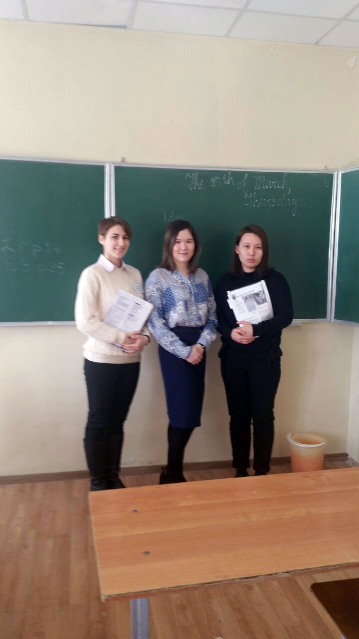 Так, например, в гимназии №5 три студентки гр. ИЯ-14-01: Блялова Динара, Бабиш Айгерим, Пархоменко Виола проходят педагогическую практику под методическим руководством к.п.н., доцента Волковой Л.В., которая посетила их открытые уроки в девятых классах и одиннадцатом классе 15 марта 2018 Уроки были проведены на должном методическом уровне. Студенты, как отмечают учителя-предметники Волчкова Т.А., Кнутова С.А., Свибович К.В., очень ответственно относятся к подготовке уроков, всегда тщательно разрабатывают поурочные планы, с энтузиазмом и любовью относятся к избранной профессии. Кроме уроков студенты-практиканты вместе с классными руководителями приняли участие в проведении внеклассных мероприятий, к которым готовились творчески и серьезно.