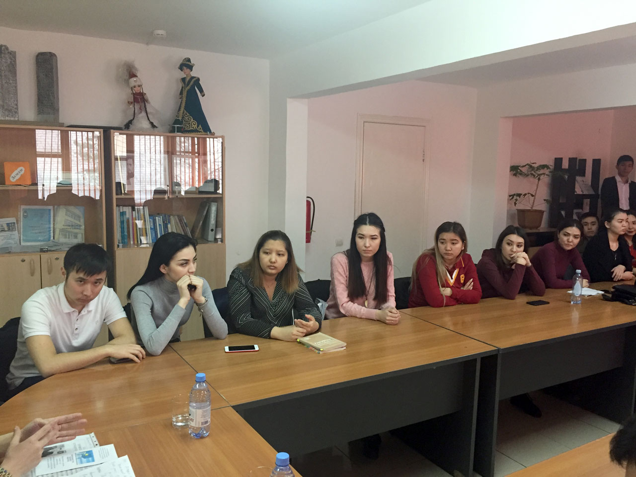 17 апреля 2018 года в рамках реализации Плана нации «100 конкретных шагов» по формированию профессионального государственного аппарата Департаментом Агентства Республики Казахстан по делам государственной службы и противодействию коррупции по городу Астана была проведена агитационная встреча со студентами, обучающимися по образовательной программе 5В030100-«Юриспруденция».