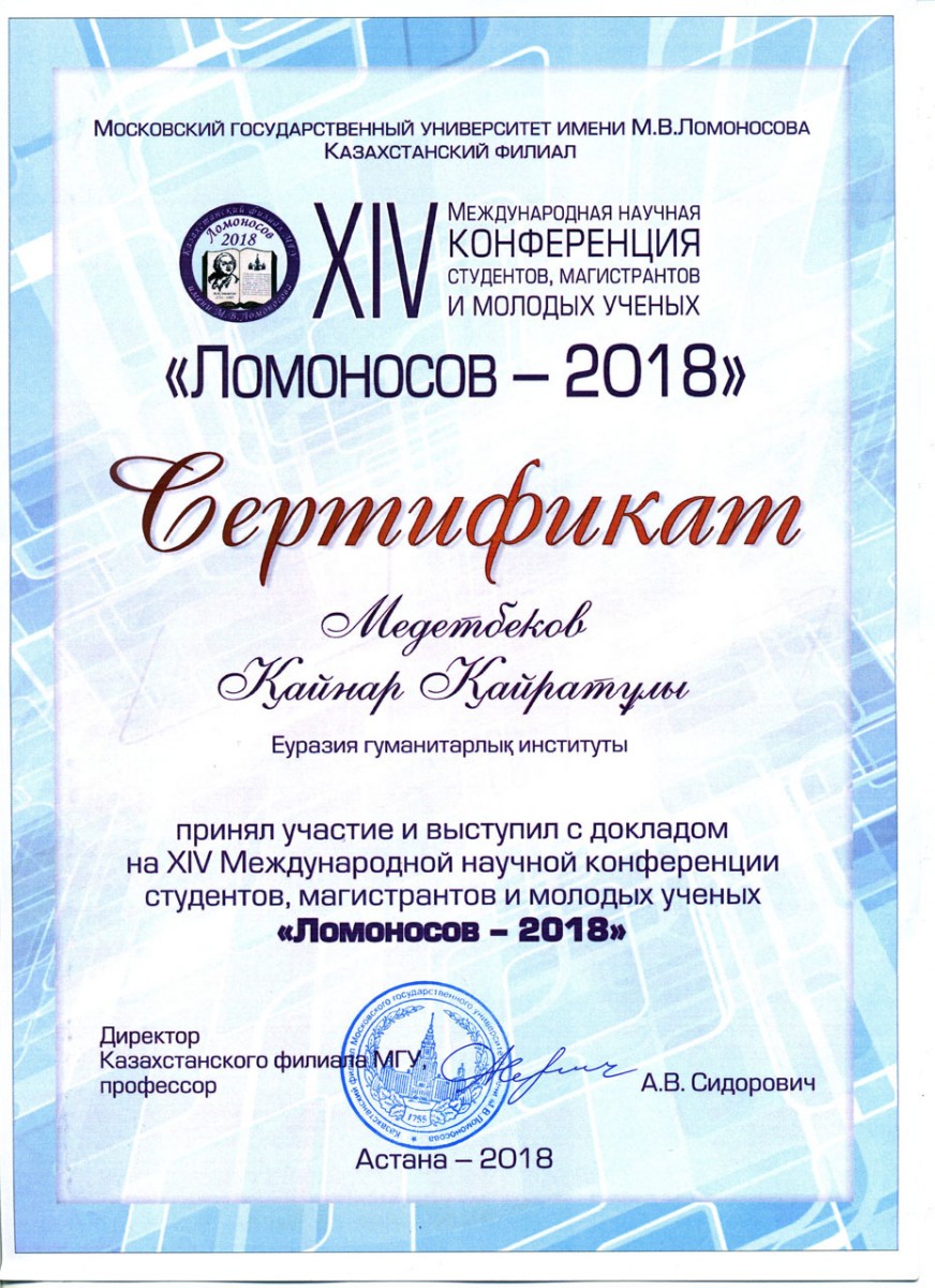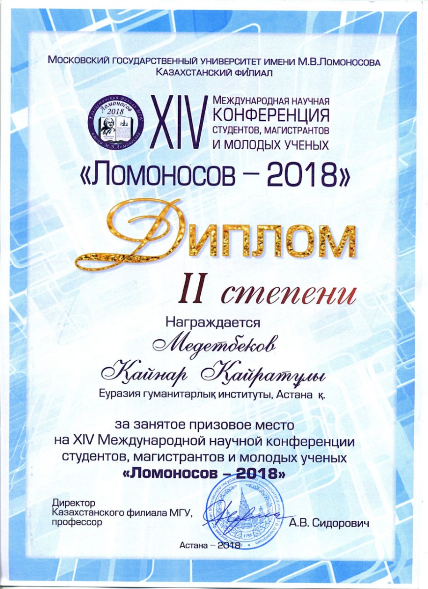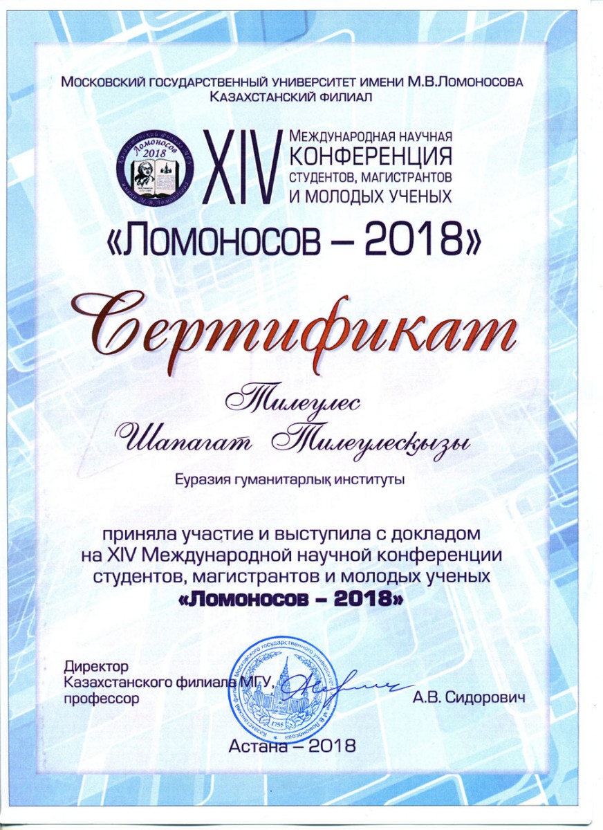 20-21 апреля студенты ЕАГИ приняли участие в работе XIV Международной научной конференции студентов и магистрантов и молодых ученых, организованной Казахстанским филиалом МГУ имени М.В. Ломоносова. По итогам конференции студент специальности “Казахский язык и литература” (КЯЛ-15-01) К. Медетбеков занял второе место (научный руководитель: магистр педагогических наук, старший преподаватель Алимбаев А.Е.). Студентка группы КЯЛ-15-01 Ш. Тілеулес награждена сертификатом за активное участие и выступление с докладом (научный руководитель: кандидат филологических наук, доцент Дауренбекова Л.Н.).