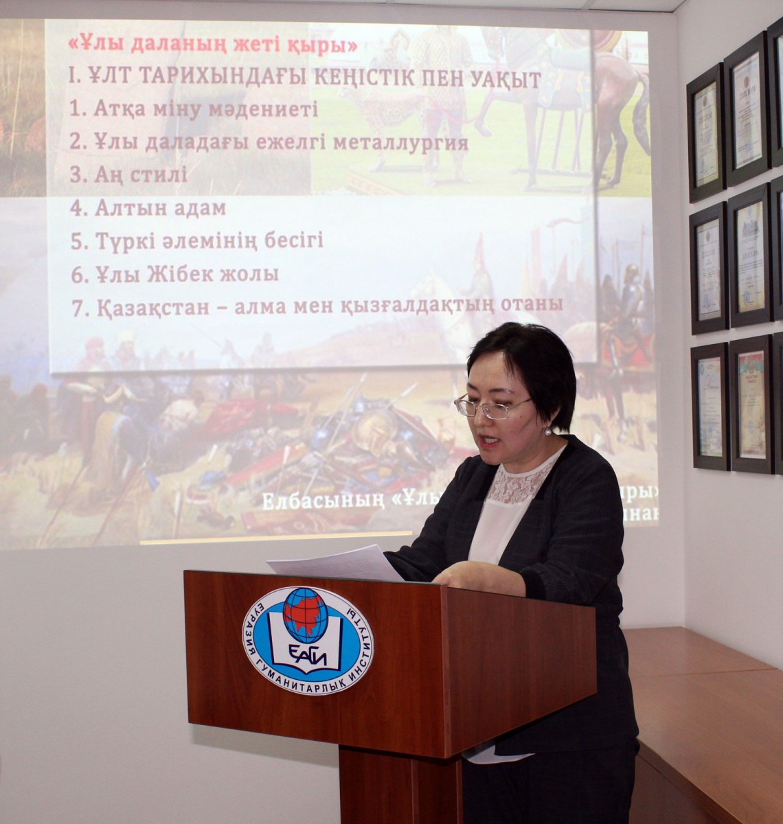 24 ноября 2018 г. на расширенном заседании Ученого совета Евразийского гуманитарного института прошло обсуждение статьи Президента РК Н.А. Назарбаева «Семь граней Великой степи». Перед присутствующими членами Ученого совета, сотрудниками и лидерами студенческой молодежи выступил ректор института, академик А.К. Кусаинов. В своей речи А.К. Кусаинов отметил актуальность и своевременность статьи, подчеркнув, что в центре внимания Президента страны – история нашей Родины и необходимость объективного понимания роли народа во всемирной истории. Каждый казахстанец должен знать историю своей страны, должен ею гордиться, осознавать её уникальность и уметь рассказать о ней всему миру.