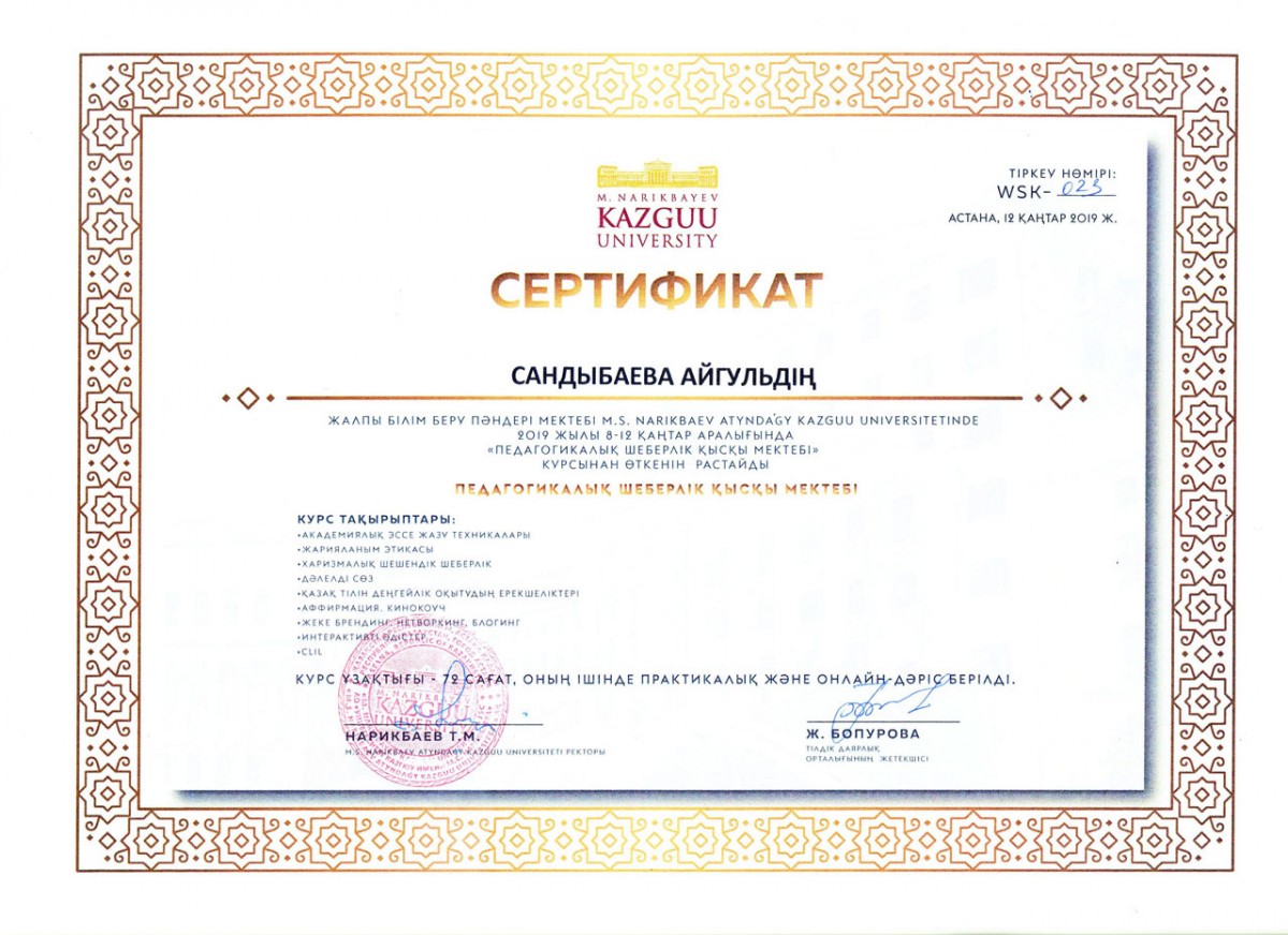 С 8 по 19 января 2019 года преподаватели кафедры казахской и русской филологии кандидат филологических наук, доцент Л.Н.Дауренбекова и магистр наук, старший преподаватель А.Т.Сандыбаева приняли участие в Зимней школе педагогического мастерства при университете КАЗГЮУ имени М.С.Нарикбаева. Во время семинара участники ознакомились с тренингами по академическим эссе, этике публикаций, принципам честности, кинокоучингу, интерактивным методам, ораторской харизме, личному бренду, блогингу, аффирмации и CLIL.