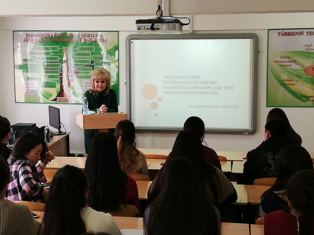 18-19 февраля 2019 года в институте состоялась открытая лекция доктора педагогических наук, профессора Сейтказы Перизат Байтешовны на тему «Методы и технологии формирования медиаграмотности обучающихся». На лекции присутствовали студенты педагогического направления и поделились своими взглядами. Сейтказы П.Б. подчеркивая важность становления медиаграмотной личности, объяснила студентам пути достижения информационной компетентности.