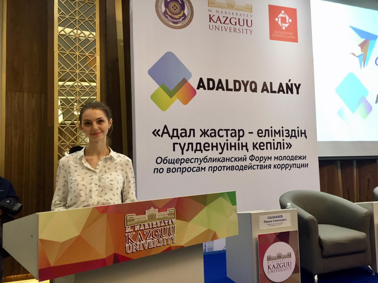 17 апреля 2019 года студенты Евразийского гуманитарного института специальности «Юриспруденция» приняли участие в Общереспубликанском форуме молодежи по вопросам противодействия коррупции «Адалжастар – еліміздің гүлденуінің кепілі», который прошел в КАЗГЮУ. Одним из спикеров форума была студентка нашего института группы ПМНО-15-01 Снегурская Валентина, которая выступила с докладом на тему «Честная молодежь».