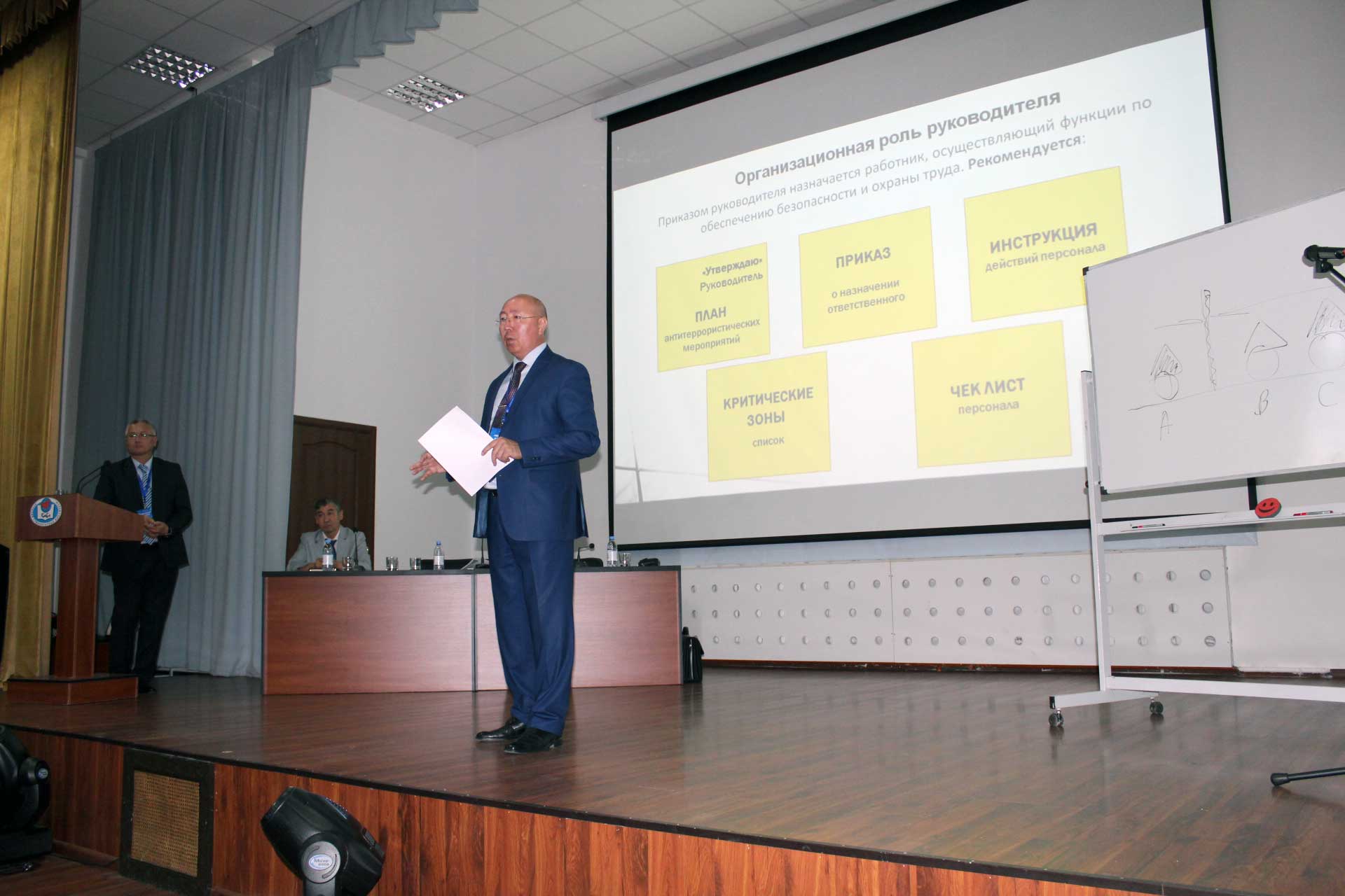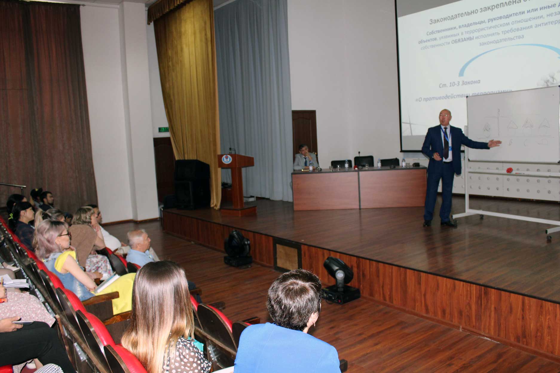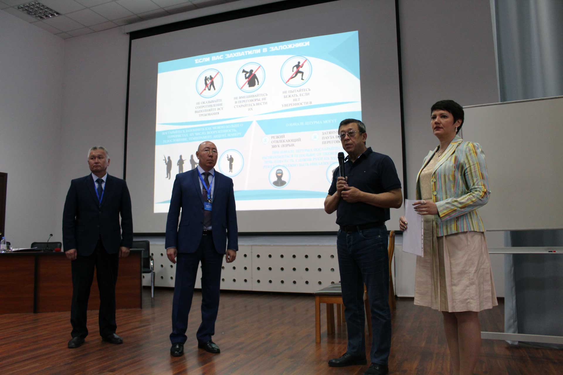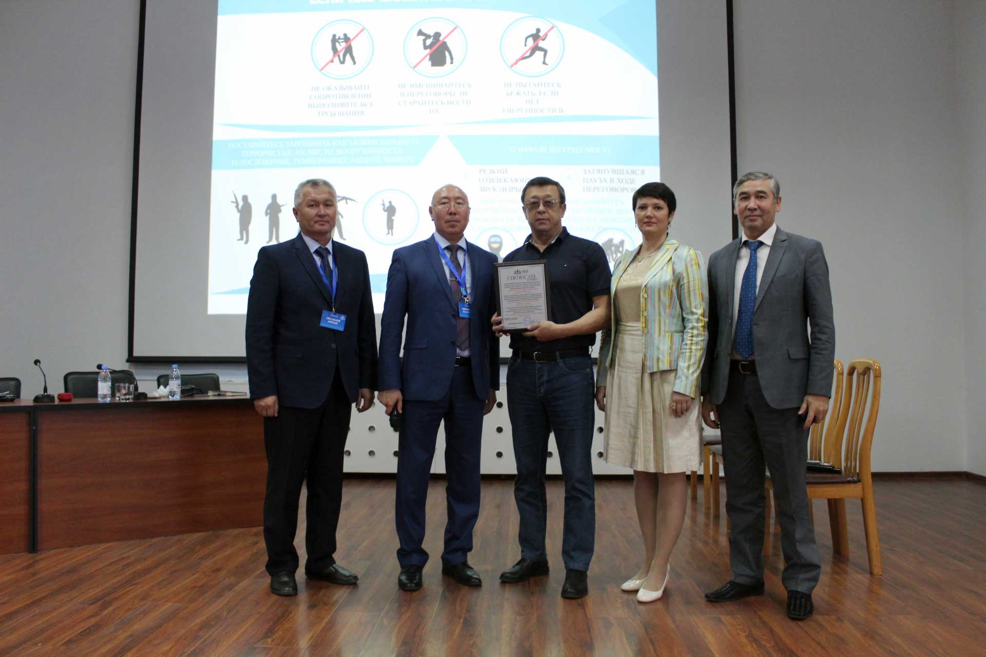 С 25 по 27 июня 2019 года в Евразийском гуманитарном институте консорциумом кампаний ТОО «TNG KZ», ТОО «НЛП и Профайлинга», ТОО «Психологическая лига» и «Научно – исследовательский институт Коммуникаций и государственной Безопасности» был проведен семинар – тренинг по теме «Обучение персонала действиям при террористической угрозе». Для административно – управленческого персонала, профессорско – преподавательского состава, обслуживающего персонала института были представлены следующие кейсы: ключевая роль руководителей в реализации требований нормативно – правовых актов, регламентирующих антитеррористическую защищенность; организация работы в вузе при террористической угрозе; взаимодействие с персоналом, охранными структурами и правоохранительным блоком; действия персонала при обнаружении подозрительного предмета, поступлении сообщений о террористическом акте, захвате заложников, эвакуации и др. Также в ходе семинар – тренинга проводились ролевые игры, демонстрировались видеоролики, фотографии событий террористических атак в местах скопления людей; слушатели выполняли логические задания. По завершении обучения руководству ЕАГИ был вручен сертификат.