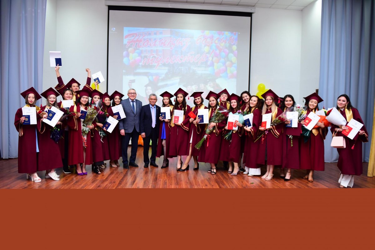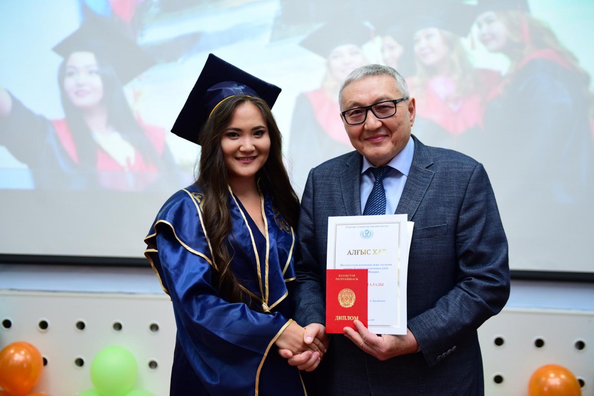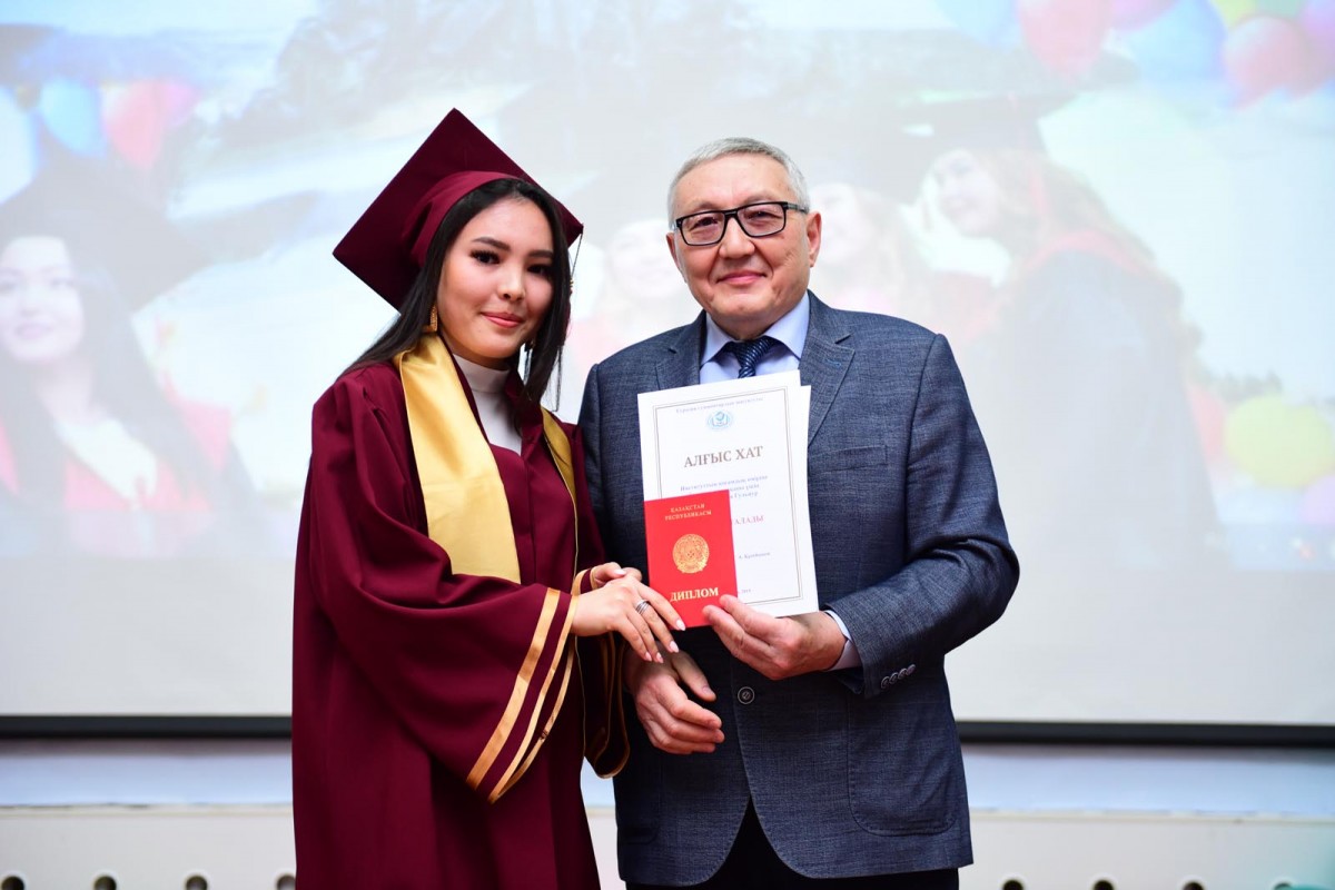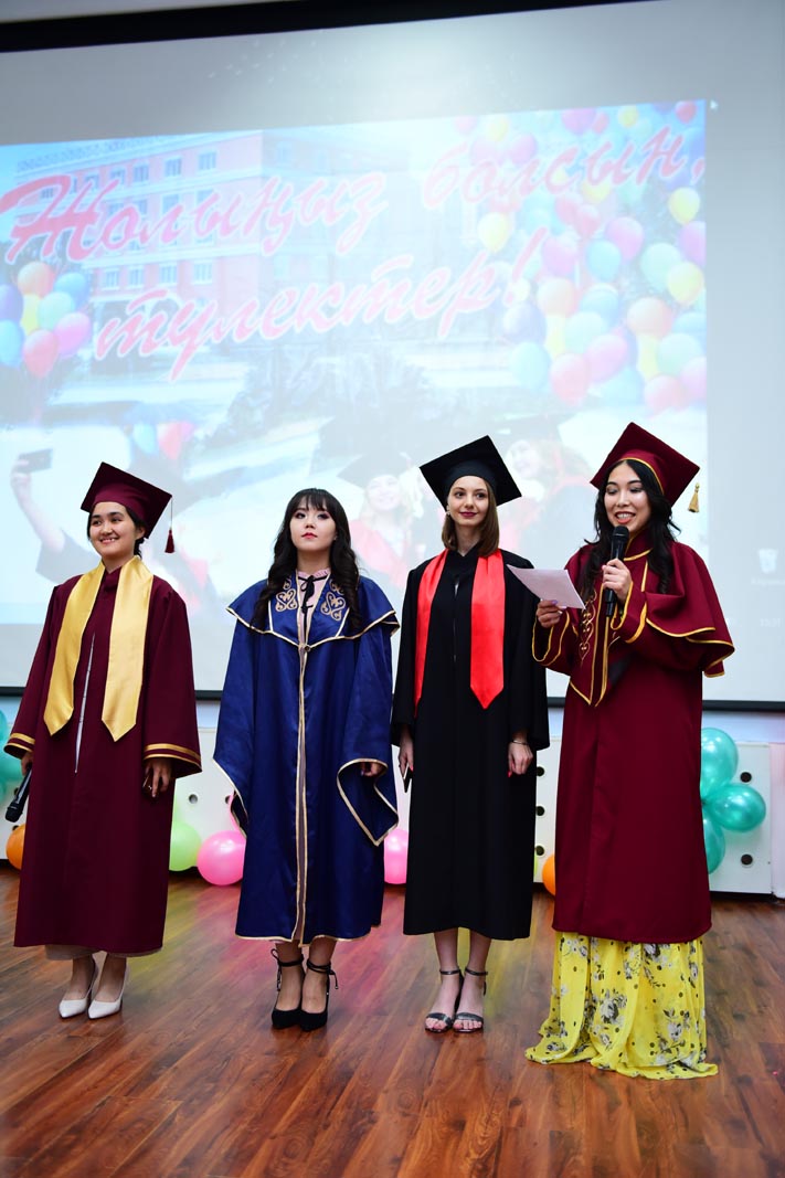 Выпускница кафедры казахской и и русской филологии, отличница учёбы, депутат молодежного маслихата города Нур-Султан, победитель конкурса «Қазақ қызы 2016», призер городских и республиканских научных конференций Дәуіт Айым, выпускница специальности «Педагогика и методика начального обучения», обладатель стипендии Президента Республики Казахстан и Фонда Первого Президента Республики Казахстан – Елбасы, вице – председатель Комитета по делам молодежи кафедры педагогики, призер Республиканского студенческого конкурса научно-исследовательских работ, проводимого Министерством образования и науки Республики Казахстан, победитель студенческих научных конференций и олимпиад, вторая вице – Мисс ЕАГИ – 2018 – Снегурская Валентина, выпускница специальности «История», отличница учёбы, обладатель стипендии Президента Республики Казахстан, победитель различных городских и республиканских научных конференций Демесинова Ақшолпан, выпускница специальности «Педагогика и психология», руководитель студенческого клуба «Асыл» жүрек», отличница учёбы Бөрібай Айжан выразили благодарность коллективу института за полученные знания и опыт. Одним из самых запоминающихся моментов Церемонии вручения дипломов стал музыкальный номер группы «ПМНО-15-01». Девушки исполнили написанную ими песню, посвященную институту, что стало завершающим аккордом четырех лет обучения в стенах родной Alma mater.