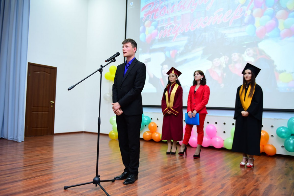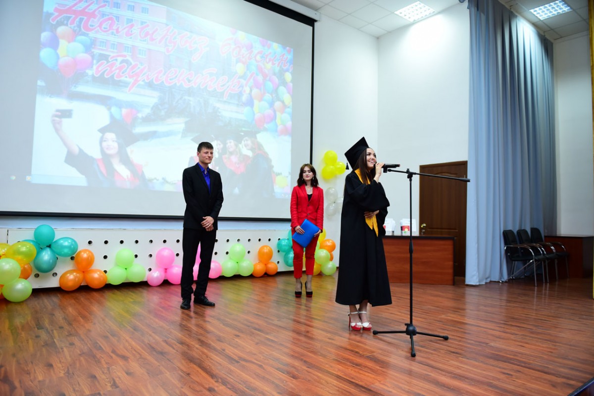 Со сцены прозвучали слова благодарности уважаемым преподавателям, дорогим родителям и поздравления своим однокурсникам выпускницы специальности «Переводческое дело», отличницы учебы, победителя III Международного конкурса научно – исследовательских работ студентов, магистрантов и аспирантов, проводимого Министерством науки и высшего образования Российской Федерации Бандура Снежаны, выпускника специальности «Юриспруденция», отличника учебы, призера Республиканского студенческого конкурса научно-исследовательских работ, проводимого Министерством образования и науки Республики Казахстан Ватылык Владимира и выпускницы специальности «Юриспруденция», отличницы учёбы, вице — председателя Комитета по делам молодежи кафедры юридических дисциплин Анапьяновой Дарины. Выпускники выразили большую благодарность коллективу института, а также своим наставникам и пообещали теоретические знания, приобретенные в стенах вуза, широко применить в своей профессиональной деятельности.