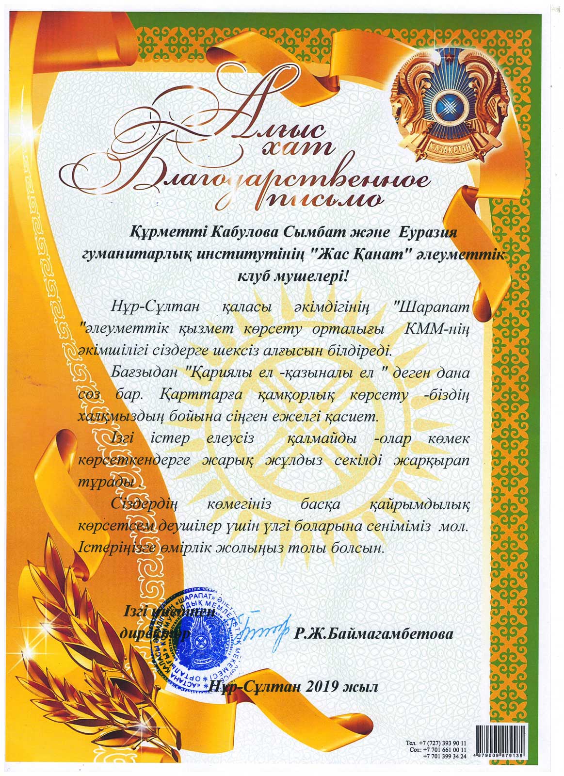 20 ноября 2019 г. в КГУ «Центре социального обслуживания «Шарапат» при акимате г. Нур-Султан прошёл концерт для пожилых людей, организованный социальным клубом «Zhas Qanat». Основной идеей концерта было вдохнуть энергию в жизнь наших пожилых горожан. Как говорит Жандос Актаев, председатель социального клуба: «К нашему удивлению, пожилые люди оказались во многом энергичнее нас самих».