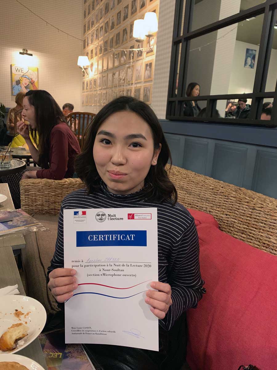 Уже в четвертый раз в столице Казахстана проходит акция «Ночь чтения», организованная Министерством культуры Франции в сотрудничестве с Посольством Франции в Казахстане. Ночь чтения в Нур-Султане прошла 18 января 2020 года. Преподаватель кафедры иностранных языков Сиренова Ботагоз Ахметовна подготовила студентку гр. ИЯК-17-02 Зарян Аяжан к участию в данном мероприятии. Аяжан прочла стихотворение «Liberté» (автор:M.Careme) на французском языке. Всем участникам Ночи чтения были вручены сертификаты и памятные подарки.