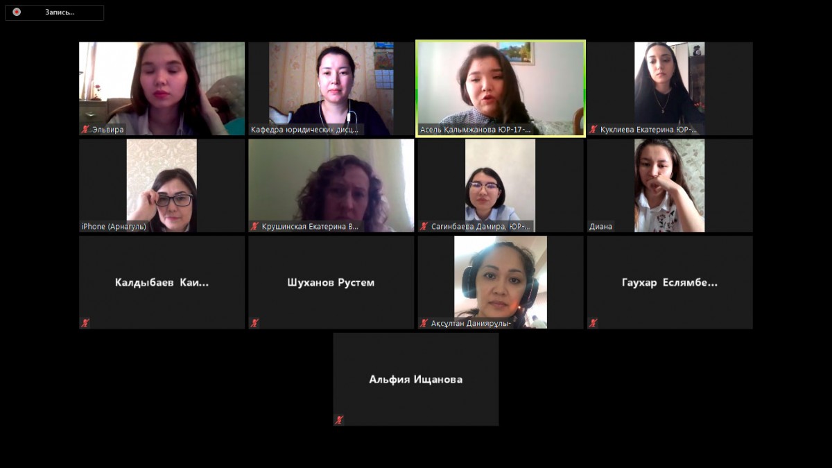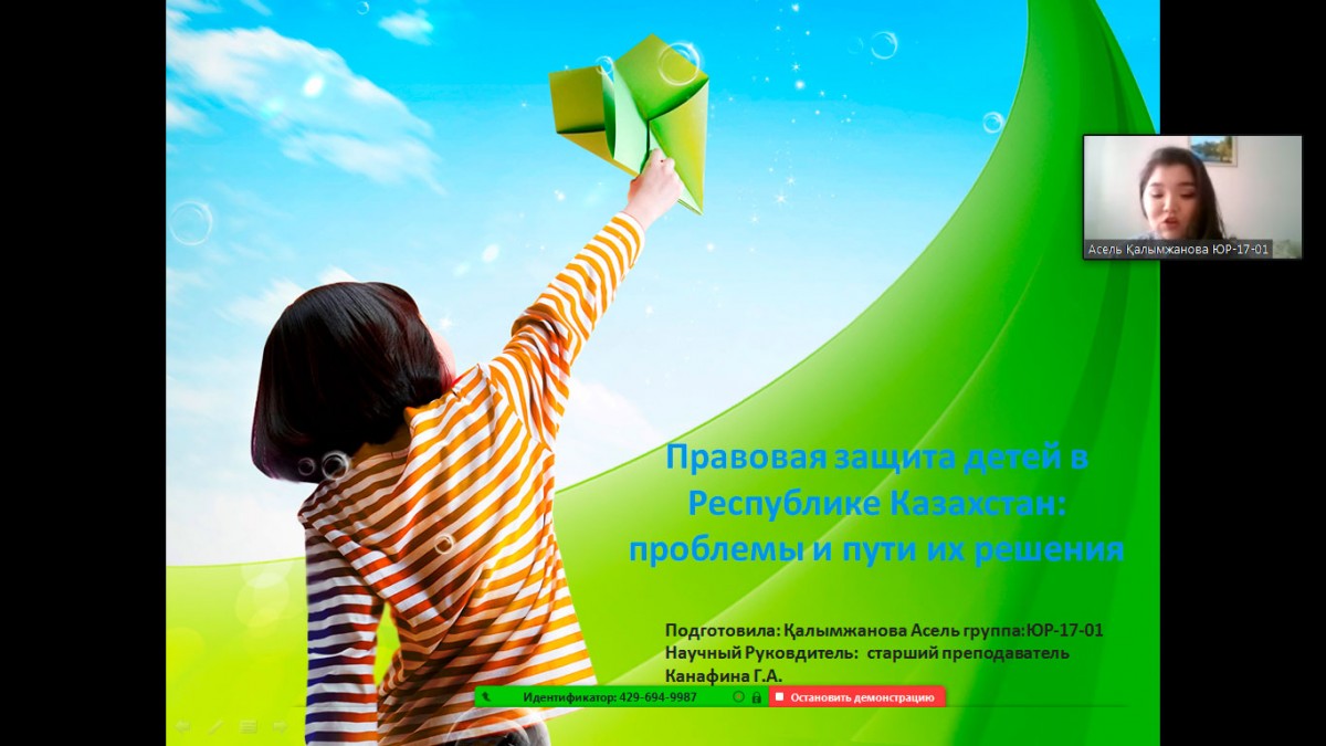 29 апреля текущего года прошел онлайн-конкурс «Территория права», организованный кафедрой юридических дисциплин, а также Комитетом по делам молодёжи кафедры юридических дисциплин. В рамках конкурса были представлены 8 докладов по таким актуальным направлениям, как торговля детьми, правовая защита детей, права людей, центральной идеей рассматривалось творчество Абая и его Личность как примера и ориентира для молодого поколения. Несмотря на то, что Казахстан в настоящее время переживает нелегкое время во всех сферах жизни общества, участники-студенты конкурса проявили желание, упорство и показали отличные знания в исследуемой сфере. Все доклады имели научную новизну, целевую направленность и перспективность изучаемой сферы для казахстанского права в целом. Что особенно порадовало – дискуссия по каждой теме доклада, и не только со стороны преподавателей, но и со стороны выступающих студентов. От лица студентов была озвучена рекомендация проводить подобные мероприятия как можно чаще, ведь это поможет им в дальнейшем при выборе потенциального места работы, а также способствует развитию юридической науки со стороны этики и морального состояния будущих юристов.