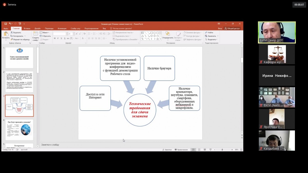 На видеоконференции были обсуждены правила проведения экзаменационной сессии в рамках реализации дистанционных образовательных технологий. Руководитель Центра дистанционного обучения Б.А.Баймамыров представил видеоинструкцию по процедуре проведения экзаменационной сессии в удаленном режиме, озвучил требования к студентам для участия в видеоконференции по проведению экзаменационной сессии, объяснил процедуру сдачи экзаменов в тестовой и устной формах.