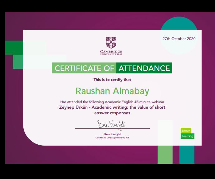 27 октября 2020года преподаватели и студенты выпускных курсов кафедры иностранных языков  приняли участие в вебинаре  «Academic writing: the value of short answer responses», разработанном  Cambridge University press. По завершении онлайн-семинара участникам были вручены электронные сертификаты.