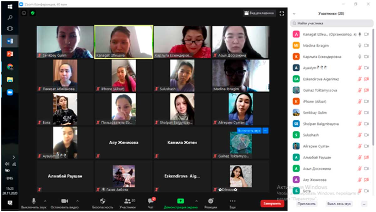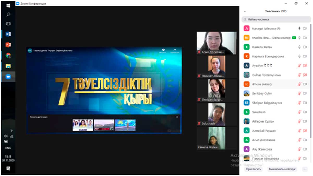 20 ноября 2020 года в группах ИЯК-17-02 (куратор Умбетова К.Е.) и ИЯК-17-01 (куратор Есимова А. К.) прошел кураторский час, посвященный Дню Первого Президента Республики Казахстан. Студенты и кураторы посмотрели документальный фильм «Тәуелсіздіктің жеті қыры: Елдіктің бастауы» на платформе» Zoom, поделились своими мнениями.