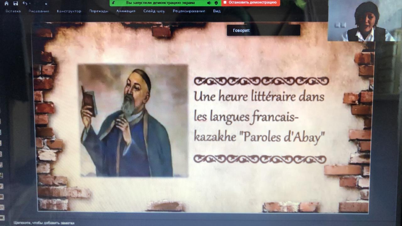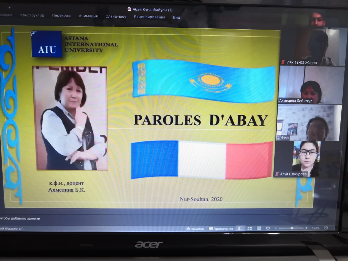 Преподаватель акцентировала внимание студентов на повторении и закреплении грамматического материала по теме «Futur Simple» посредством выполнения грамматических упражнений, тестов, просмотра презентации по данной теме. Студенты приняли активное участие в выполнении заданий и показали хорошее знание грамматического материала. Также преподаватель Ахмедина Б.К. провела литературный час, посвященный творчеству Абая. Была показана презентация, в которой были использованы фрагменты стихов и песен Абая на казахском, русском и французском языках, демонстрировались фотографии памятников Абаю в разных городах Казахстана, живописные места Семея, фотографии Абая с сыновьями. Занятие получилось насыщенным и интересным, познавательным.