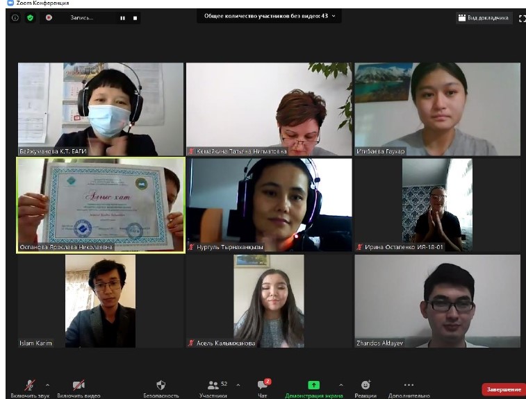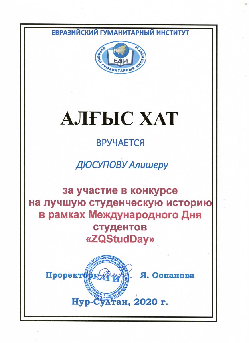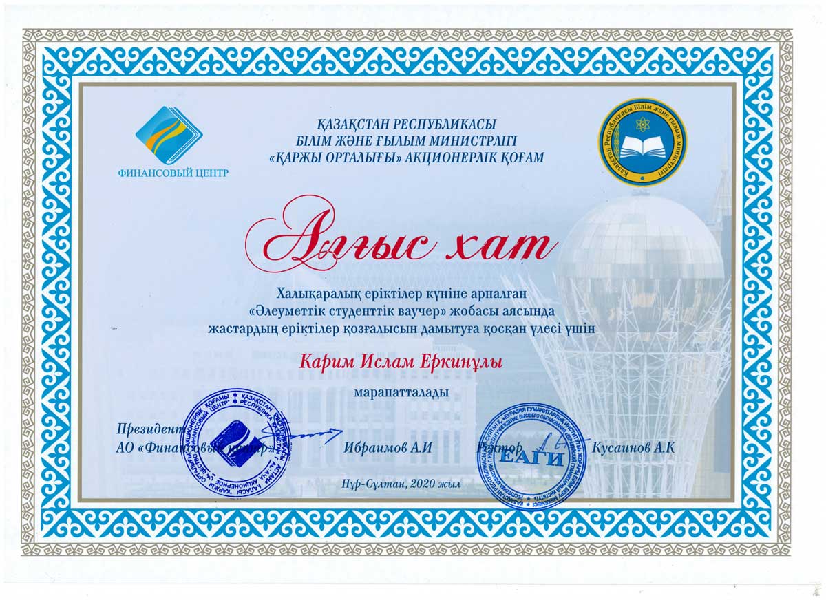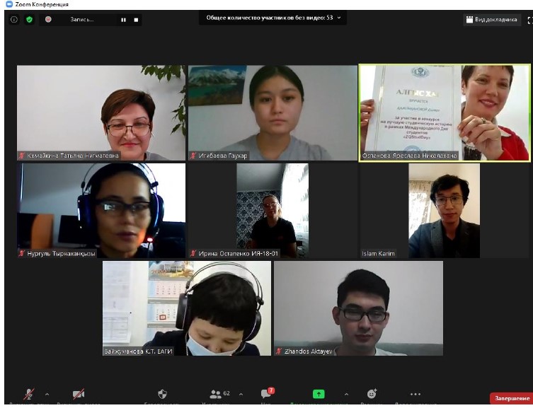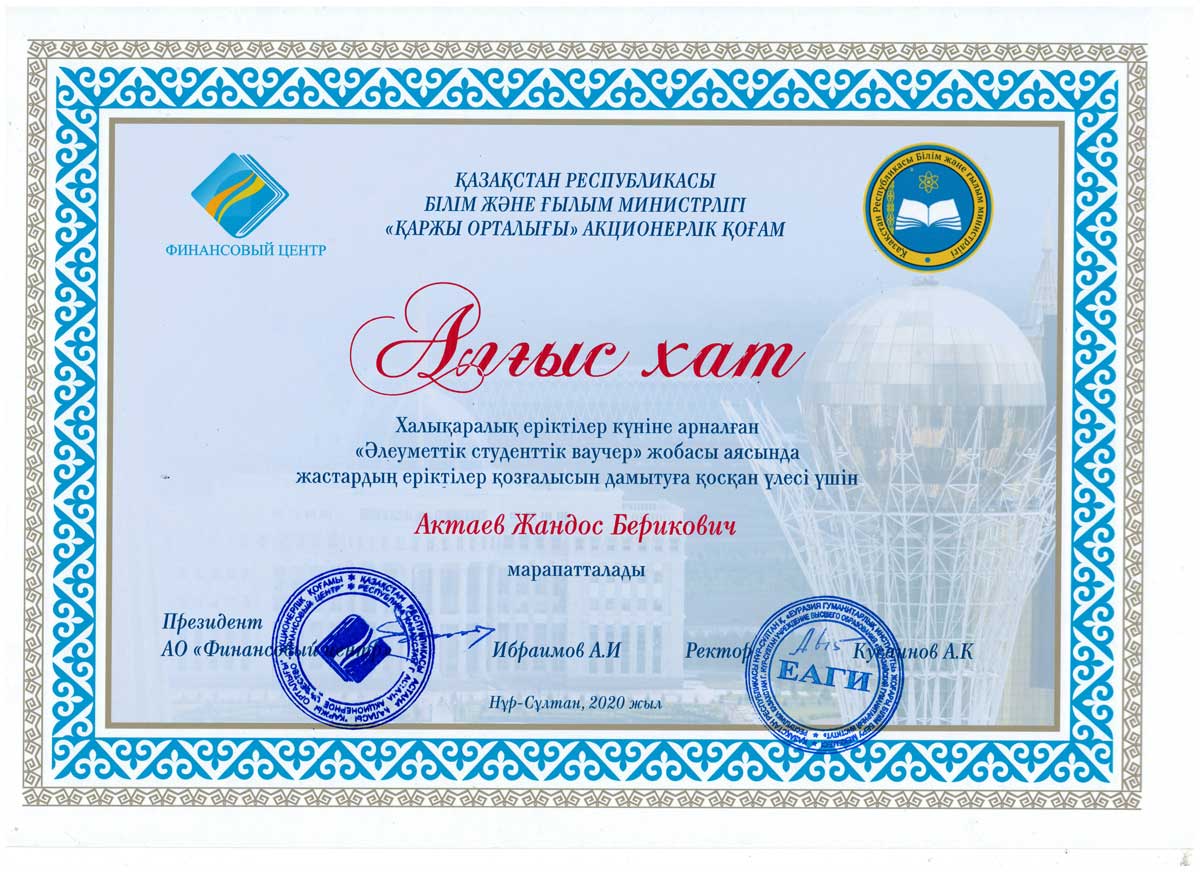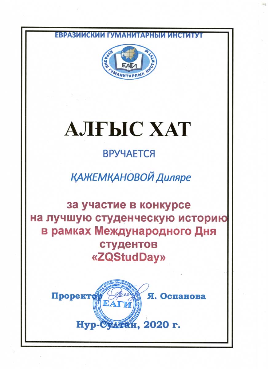 Председатель студенческого социального клуба «Zhas Qanat» Актаев Жандос вручил благодарственные письма и ценные призы за участие в конкурсе на лучшую студенческую историю в рамках Международного Дня студентов «ZQStudDay» Қажемқановой Диляре (специальность «Юриспруденция») и Дюсупову Алишеру (специальность «Переводческое дело»).