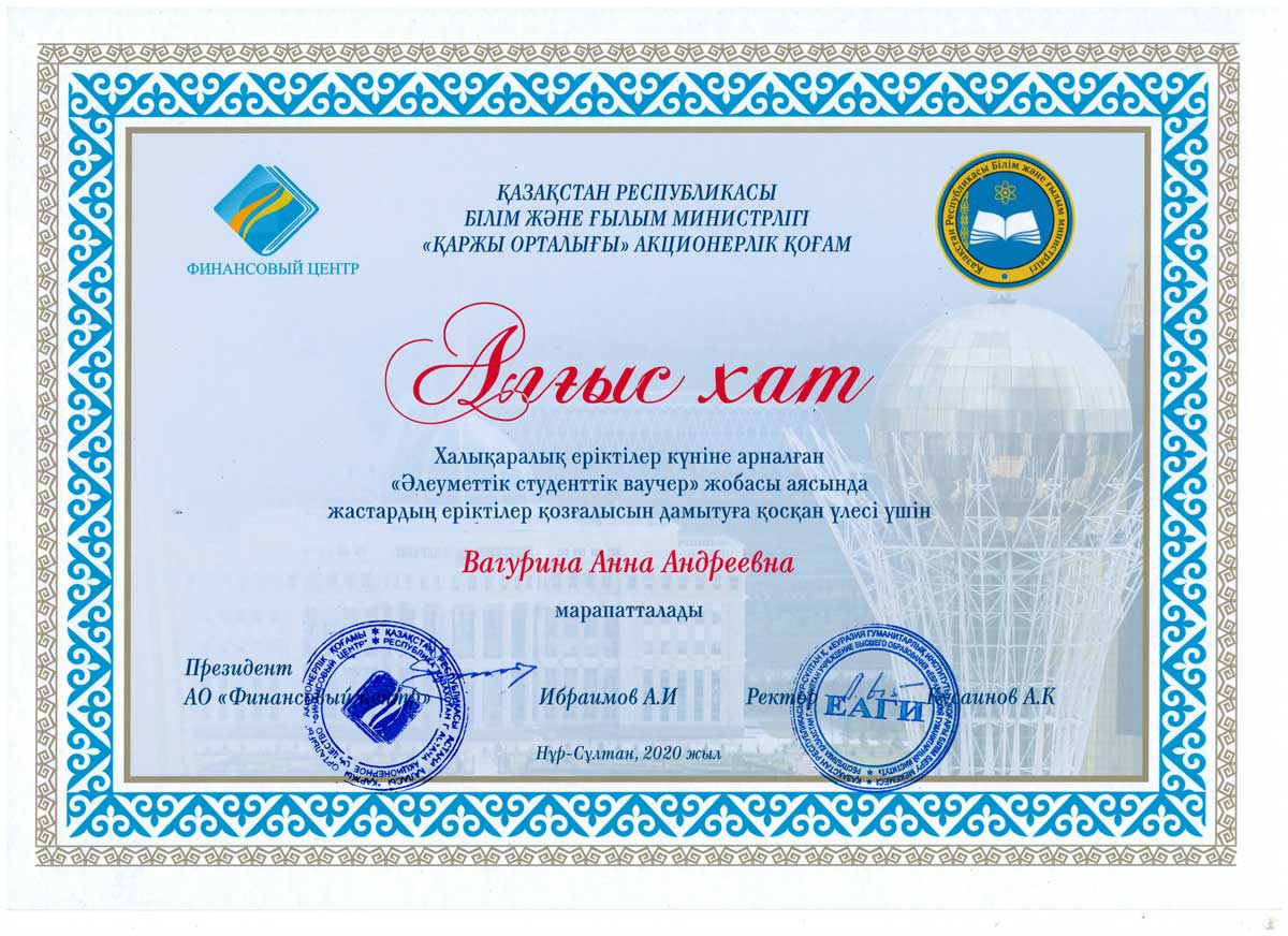 Также в преддверии Международного дня волонтеров были вручены благодарственные письма Министерства образования и науки Республики Казахстан за вклад в развитие молодежного волонтерского движения в рамках проекта «Социальный студенческий ваучер» следующим студентам: Вагуриной Анне (специальность «Иностранный язык: два иностранных языка»), Актаеву Жандосу (специальность «Юриспруденция»), Карим Исламу (специальность «Переводческое дело»). Декан института, кандидат педагогических наук, доцент Кемайкина Татьяна Нигматовна, поздравив студентов со столь значимым достижением, рассказала о своем опыте участия в волонтерской деятельности.