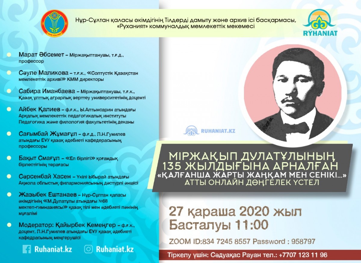 Управление по развитию языков и архивного дела акимата города Нур-Султан и коммунальное государственное учреждение «Руханият» организовали онлайн круглый стол на тему «Қалғанша жарты жаңқам мен сенікі», посвященный 135-летию Миржакыпа Дулатулы, в котором приняли участие заведующий кафедрой казахской и русской филологии, к.ф.н., доцент Л.Н. Дауренбекова и м.п.н., старший преподаватель А.Е. Алимбаев.