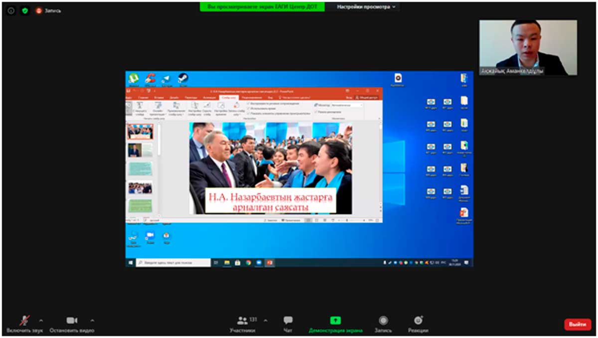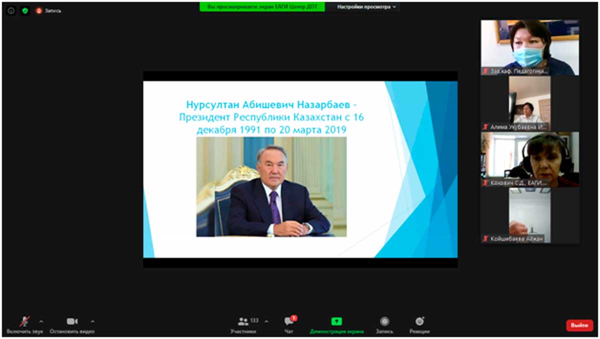 С докладами о роли Первого Президента в становлении Независимости Республики Казахстан выступили: к.и.н., доцент Г.Б.Сулейменова – «Идеи Евразийства в деятельности Первого Президента РК Н.А.Назарбаева»; студенты специальности «История»: Хауек Ақжайық – «Н.А.Назарбаевтың жастарға арналған саясаты»; Умаров Тойлыбек – «Тәуелсіздіктің жеті қыры; Кабденова Мадина – «Елордамыз Нұр-Сұлтан жарқын болашақ кепілі».