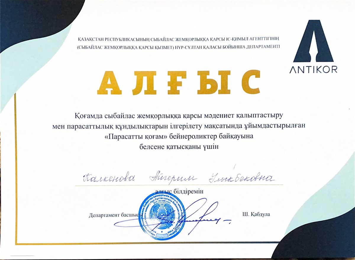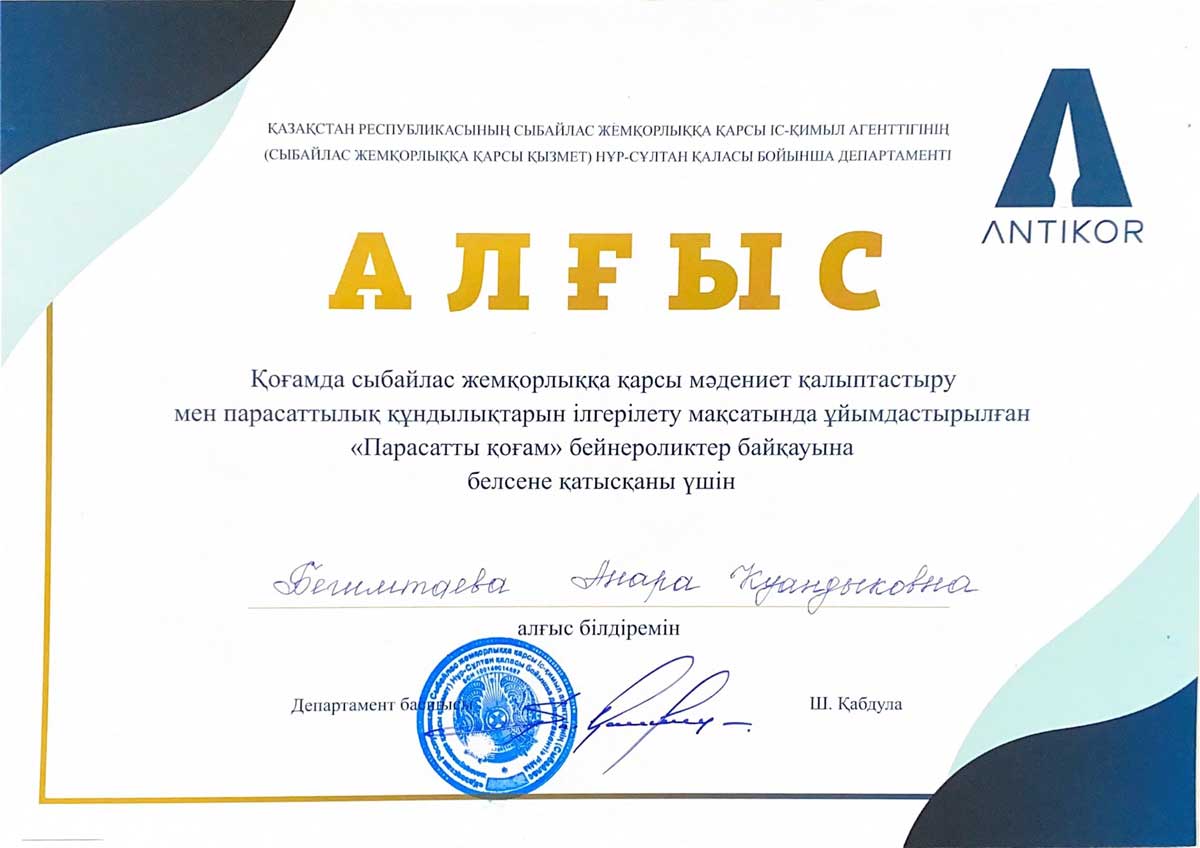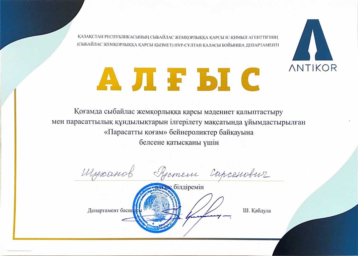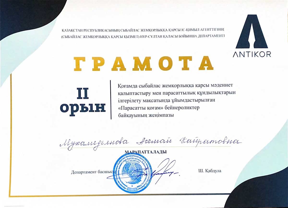 25 декабря 2020 года в конкурсе видеороликов «Парасатты қоғам», организованном Департаментом Агентства РК по противодействию коррупции по городу Нур-Султан в целях формирования антикоррупционной культуры и продвижения ценностей добропорядочности в обществе, студентка 3 курса образовательной программы «Юриспруденция» Евразийского гуманитарного института Мухамедьянова Асемай Кайратовна приняла участие с видеороликом «Формирование и развитие принципов добропорядочности как основы противодействия коррупции», став призером 2 места.