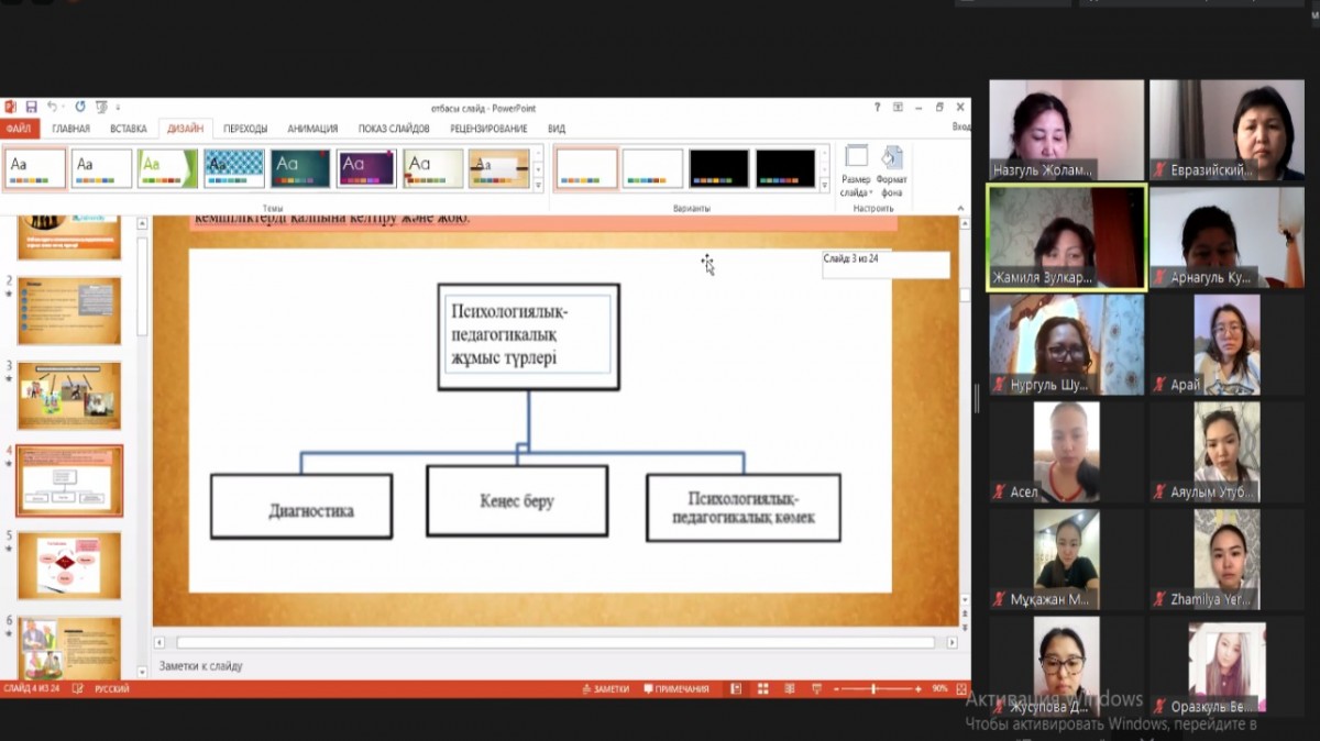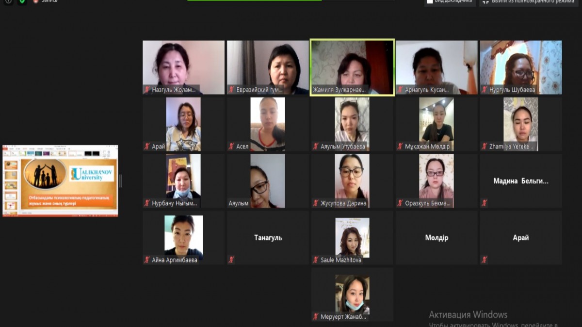 На основании договора о взаимном сотрудничестве между Кокшетауским университетом имени Ш. Уалиханова и Евразийским гуманитарным институтом старший преподаватель кафедры социальной и возрастной педагогики, магистр педагогических наук Зулкарнаева Жамиля Амангельдиновна 27 ноября 2020 года  провела онлайн-занятия со студентами 3 курса специальности  «Дошкольное обучение и воспитание» по модулю «Психолого-педагогические основы семейного воспитания». Ход занятия строился в форме диалога, активность студентов была очень высокой.