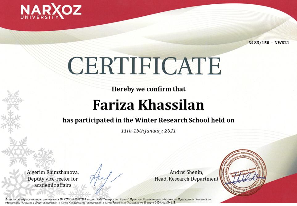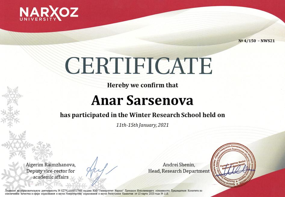 По итогам работы Зимней школы участники получили сертификаты об участии в Narxoz Winter School.