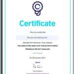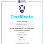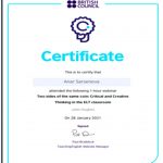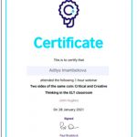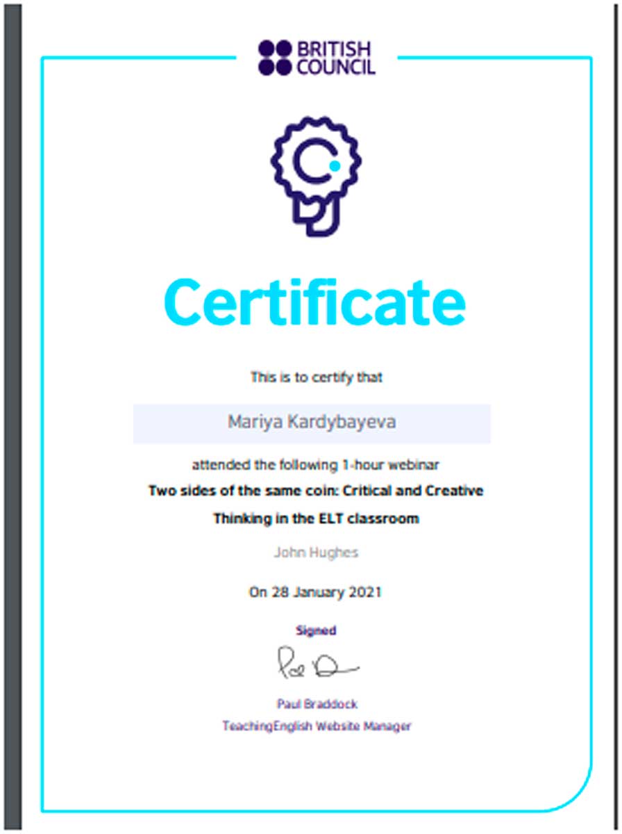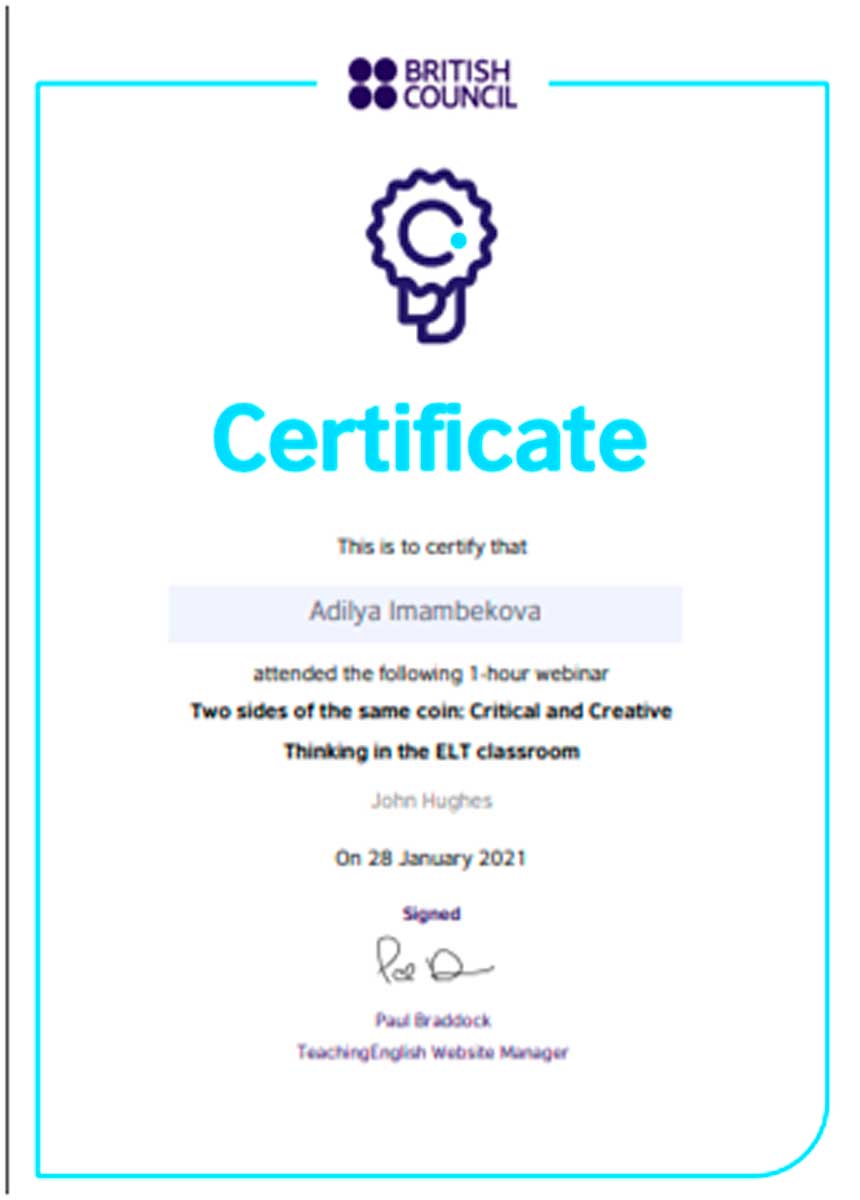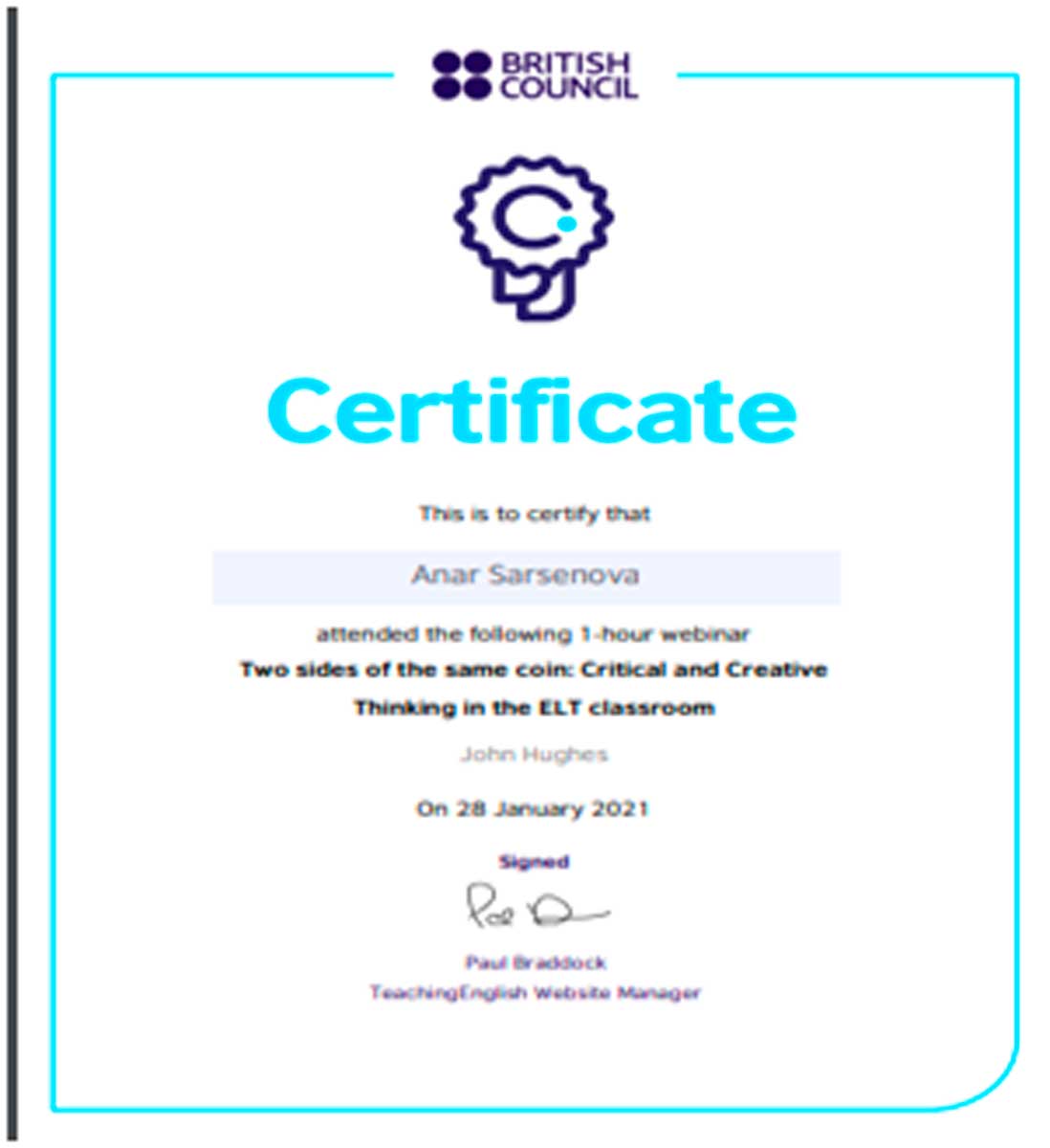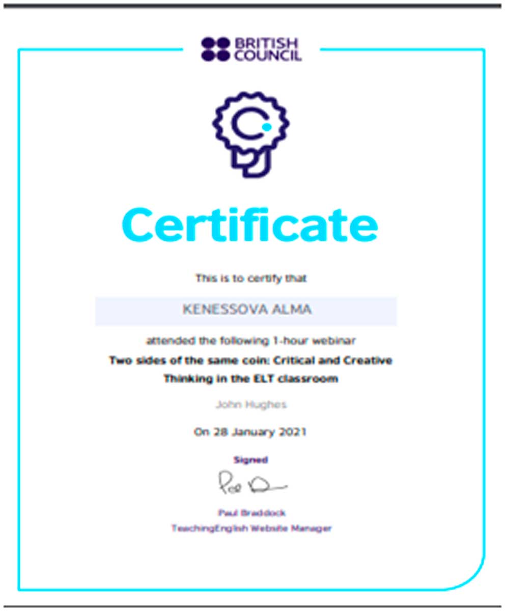 28 января 2021 года старшие преподаватели кафедры иностранных языков Сарсенова А.М. и Кардыбаева М.С., вместе со студентами групп ИЯС-18-01 и ИЯ-18-01 посетили вебинар на тему: «Two sides of the same coin: Critical and Creative Thinking in the ELT classroom», который провел John Hughes от компании «British Council». По окончанию вебинара участники получили сертификаты.