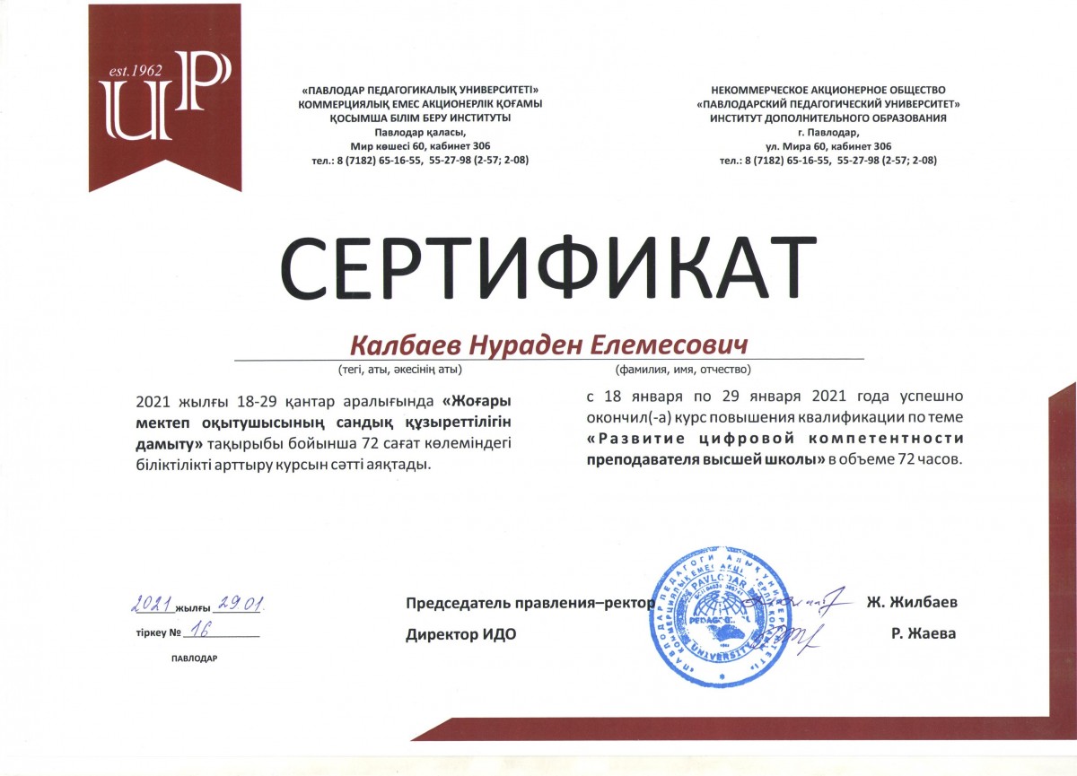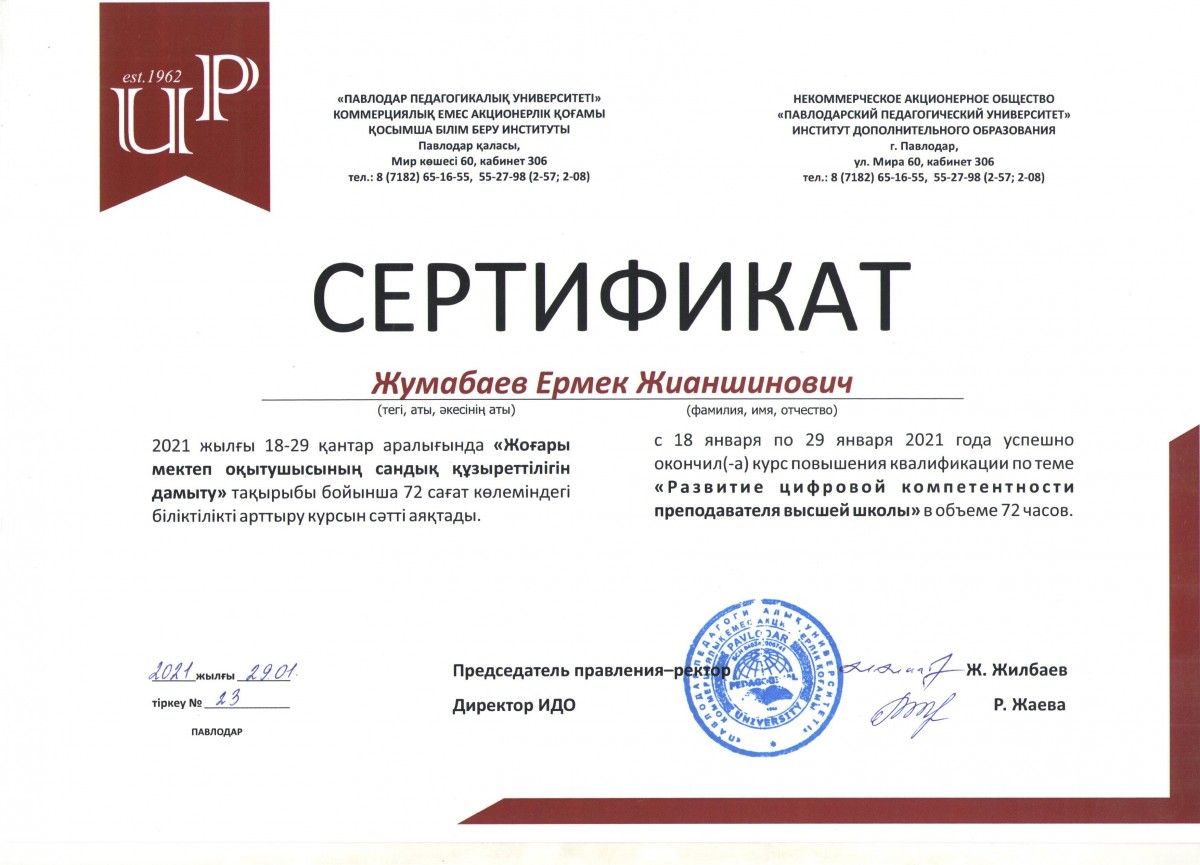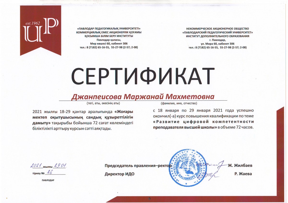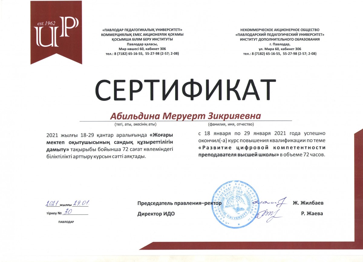 С 18 по 29 января 2021 года успешно прошли в режиме онлайн на платформе ZOOM курсы повышения квалификации для специалистов Института дополнительного образования Павлодарского педагогического университета и преподавателей Евразийского гуманитарного института на тему «Развитие цифровых компетенций преподавателя Высшей школы» в объеме 72 часов.