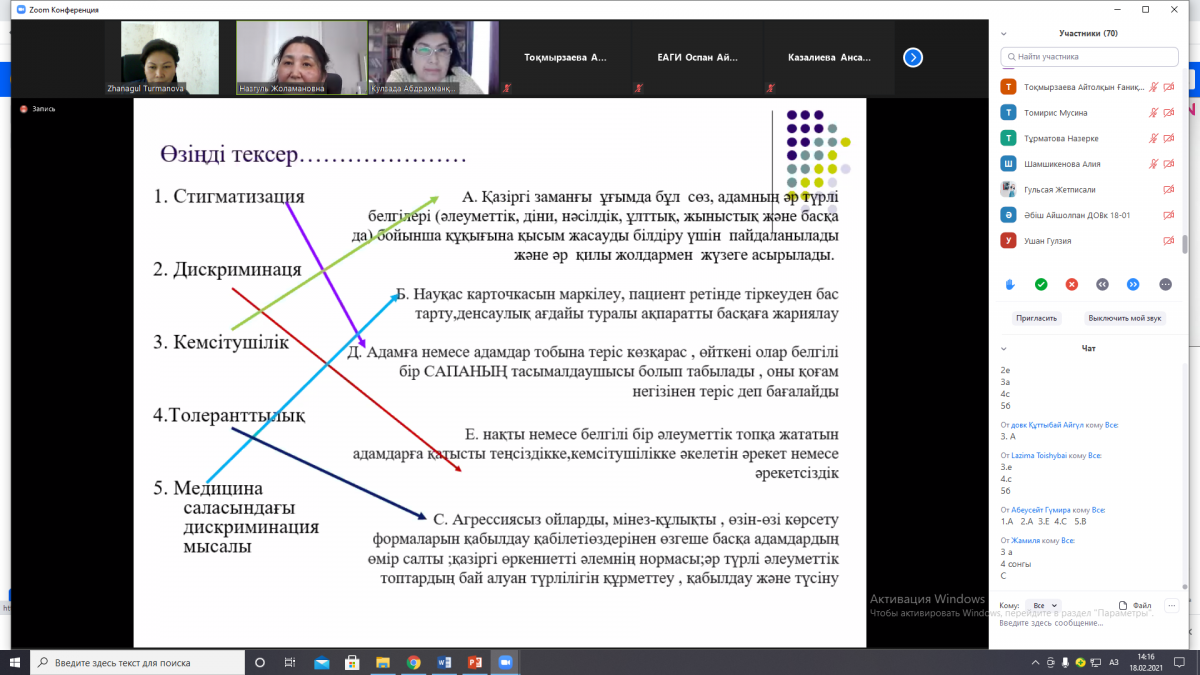 18 февраля 2021 года на основе данной программы Турманова Ж.Е. и Болатбекова Н.Ж. провели онлайн семинар-тренинги на республиканском уровне на темы «Защита детей от жестокости», «Стигма и преодоление дискриминации». В онлайн семинаре-тренинге приняли участие студенты образовательных программ ЕАГИ «Педагогика и психология», «Педагогика и методика начального обучения», «Педагогика дошкольного воспитания и обучения», студенты и профессорско-преподавательский состав образовательной программы «Социальная работа» Университета Нархоз и Кызылординского университета имени Коркыт Ата.