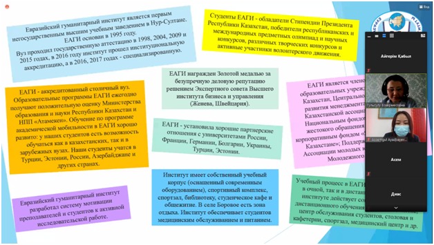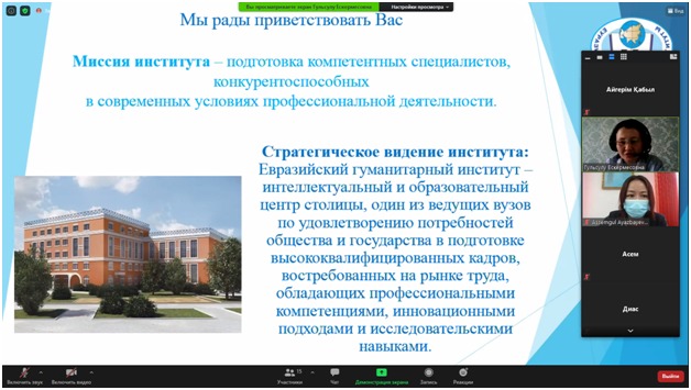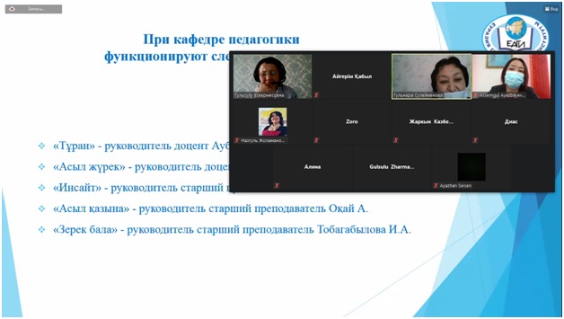 Профориентационный онлайн – семинар открыла заместитель заведующей кафедрой педагогики, доцент АязбаеваА.Т. ППС кафедры доценты Сулейменова Г.Б., Аязбаева А.Т., старшие преподаватели Тобагабылова И.А., Болатбекова Н.Ж. представили выпускникам 2021 года полную информацию о каждой специальности Евразийского гуманитарного института. Подробно была освещена деятельность студенческих клубов, функционирующих при кафедре педагогики: «Асыл жүрек», «Инсайт», «Зерек бала».