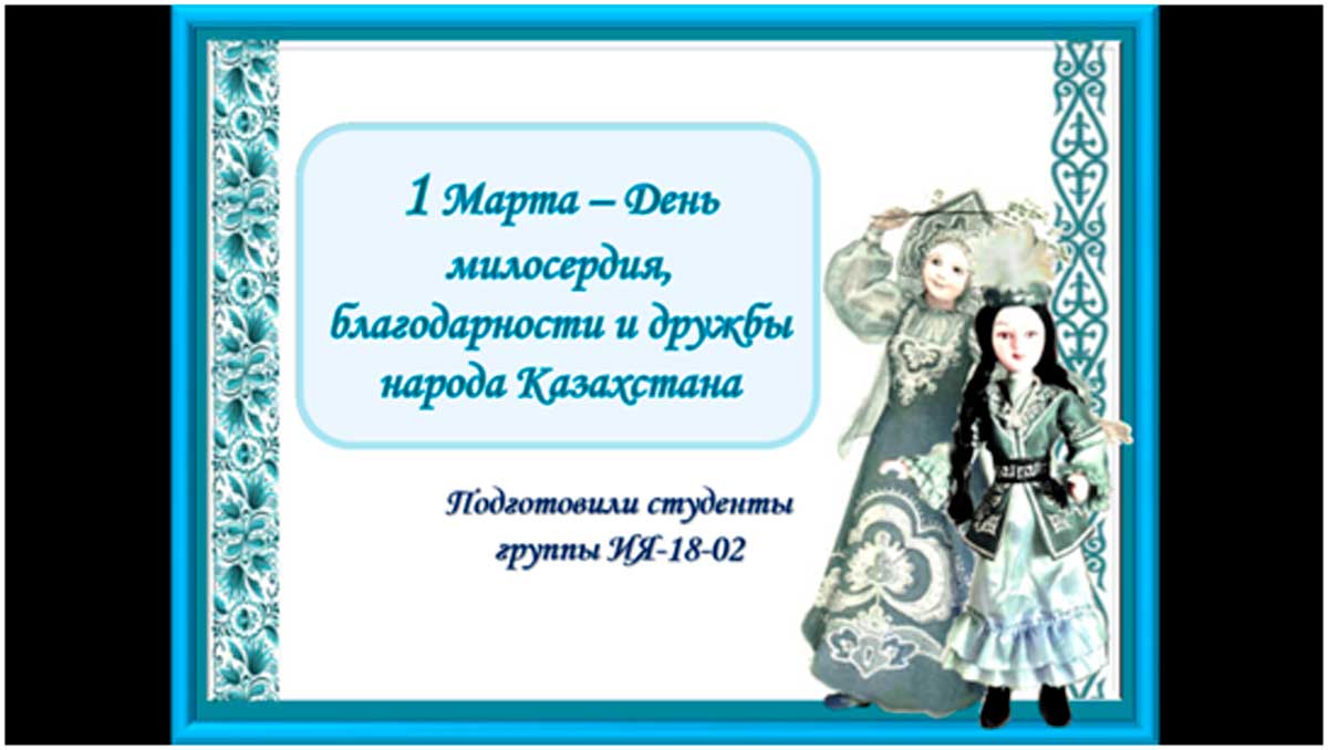 26 февраля 2021 года м.п.н., старшим преподавателем Кардыбаевой М. С. был проведен кураторский час в группах ИЯ-18-01, ИЯ-18-02 на тему «День благодарности в Казахстане», посвященный ко Дню благодарности. Во время кураторского часа был просмотрен фильм «С благодарностью казахскому народу». Студенты обсудили историю праздника, рассказали о временах переселениях народов на земли Казахстана, поделились своими впечатлениями и мнением о том, что данный праздник важен для каждого гражданина Казахстана.