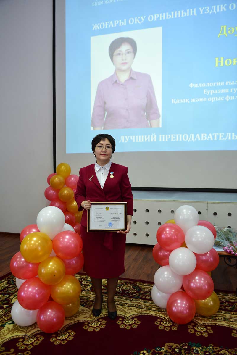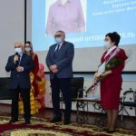 Далее в институте состоялось чествование победителя конкурса «Лучший преподаватель вуза 2020 года» – заведующей кафедрой казахской и русской филологии, к.ф.н., доцента Дауренбековой Л.Н.