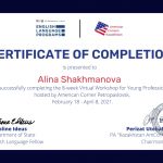 С 18 февраля по 8 апреля 2021 года студенты группы ИЯ-18-01 Шахманова А. и Алишерова А., под руководством м..п.н, старшего преподавателя Сарсеновой А.М., принимали участие в работе 8 недельного «Virtual Work shop» от American Corner Petropavlovsk. Имеются сертификаты участников.