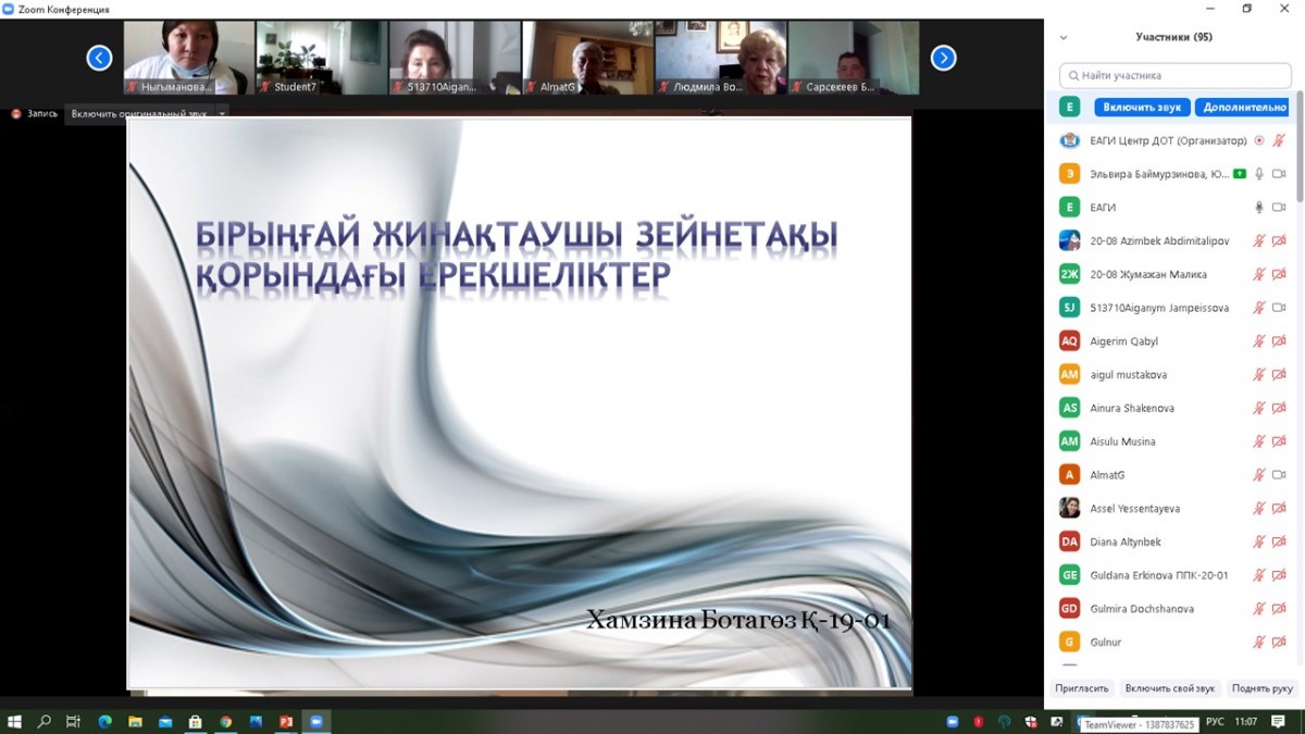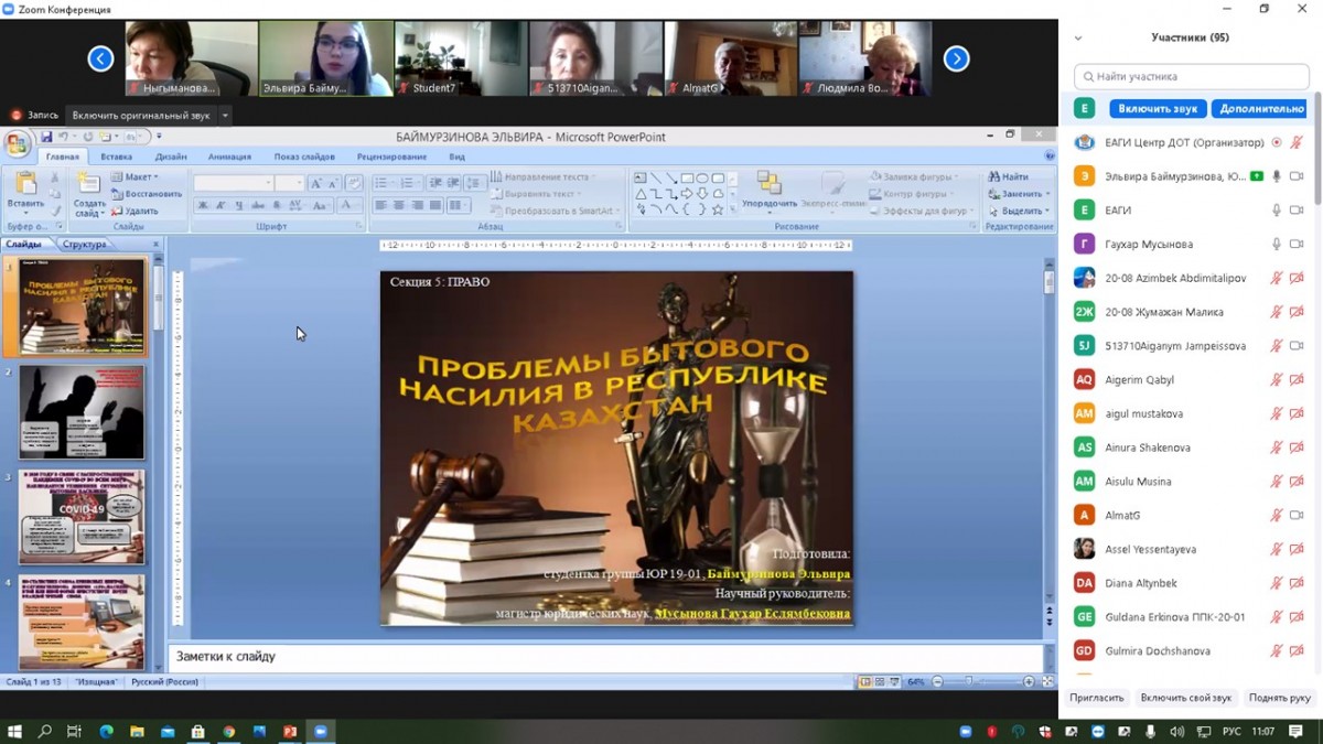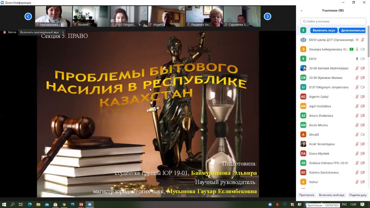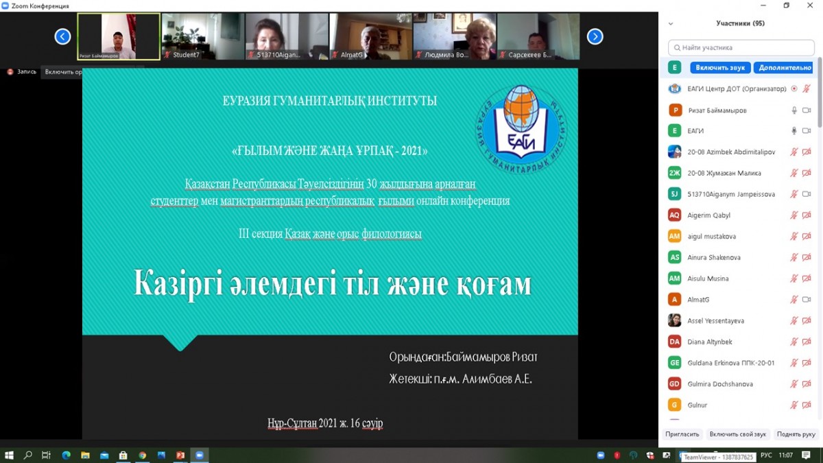 В работе онлайн конференции приняли участие более 150 студентов, магистрантов и учащихся из многих учебных заведений г. Нур-Султан (Евразийский гуманитарный институт, Евразийский национальный университет имени Л.Н. Гумилева, Казахский агротехнический университет имени С.Сейфуллина, Казахский университет экономики, финансов и международной торговли, колледж ЕАГИ, школа-гимназия №32, школа-лицей 70 и др.), г. Алматы (Казахский государственный университет им. Абая ), г. Кокшетау (Кокшетауский государственный университет им.Ш.Валиханова) и др.