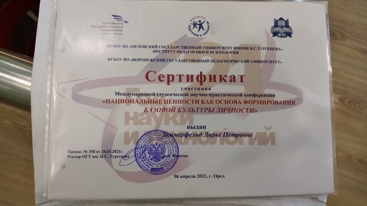 6 апреля 2021 года состоялась международная студенческая научно-практическая онлайн-конференция «Национальные ценности как основа формирования базовой культуры личности», проходившая на базе Орловского государственного университет имени И.С. Тургенева (Россия).