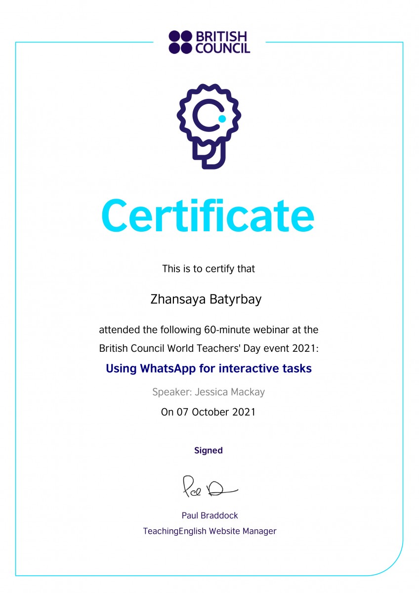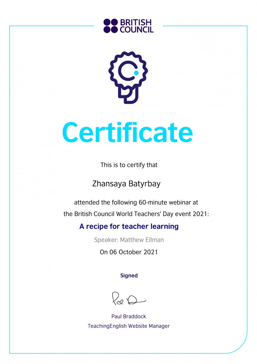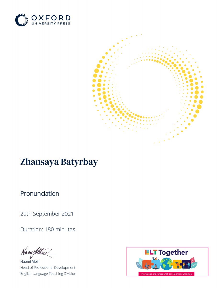 С 27 сентября по 8 октября 2021 года студенты группы ИЯК-18-02 кафедры иностранных языков под руководством старшего преподавателя Сарсеновой Анар Мадибековны приняли участие в следующих вебинарах. Такихкак “Assessment for learning”, “Pronunciation”, “Literature and Extensive Reading”, от Oxford University Press, Tony Green и Paul Woodfall, также British Council, Joe Dale – “Quizzing tools, retrieval practice and multi – modal feedback in language lessons”. В соответствии с требованиями XXI века студенты учатся не только в стенах института, но и стремятся к международному образованию. По окончании вебинаров студентам были вручены сертификаты.