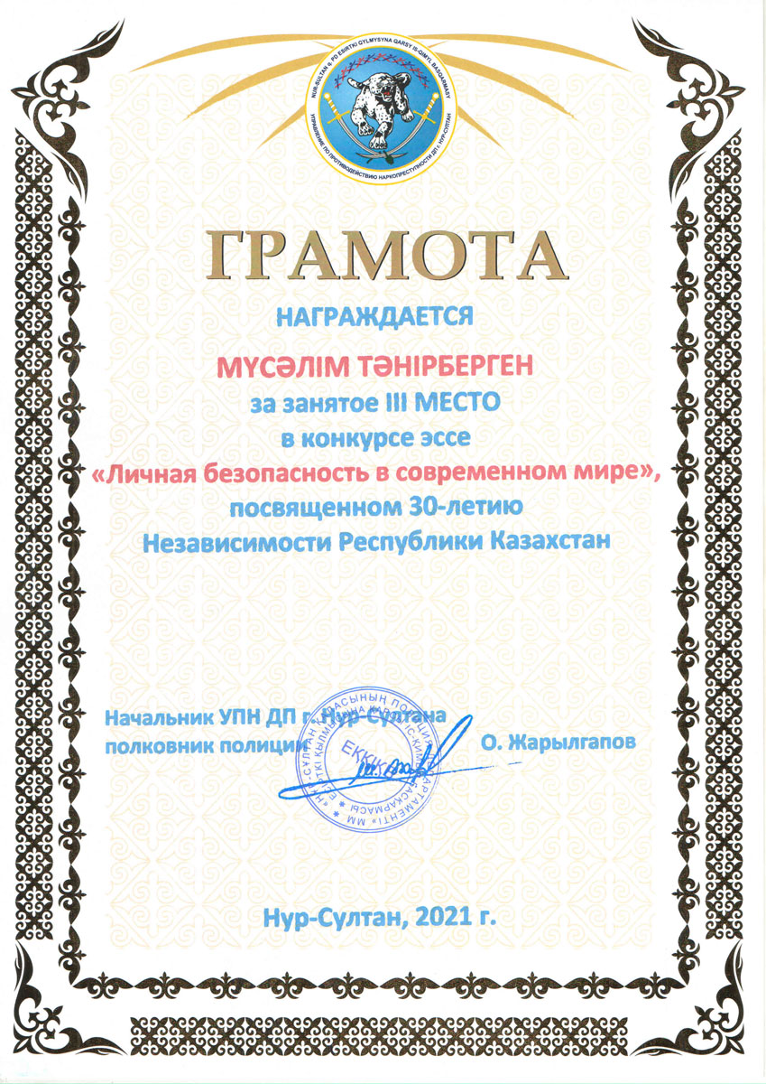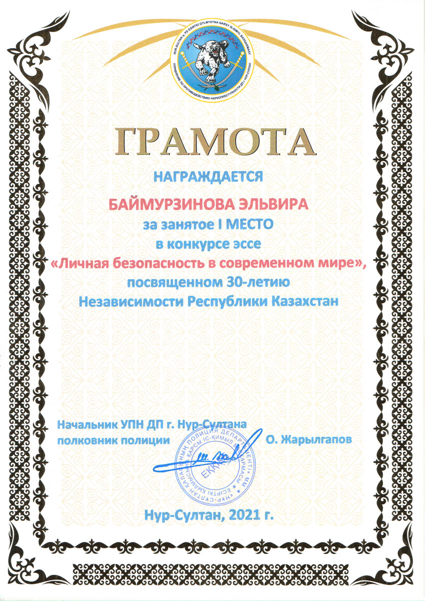 С 4 по 20 октября 2021 года в Евразийском гуманитарном институте проходил конкурс эссе на тему «Личная безопасность в современном мире», посвященный 30-летию Независимости Республики Казахстан, который был организован совместно с Управлением по противодействию наркопреступности Департамента полиции г.Нур-Султан. В конкурсе приняли участие студенты образовательной программы «Юриспруденция».
