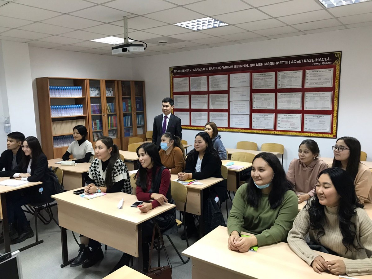 Старший преподаватель кафедры казахской и русской филологии Аслан Есимханович провел открытое занятие по дисциплине «Историография казахского литературоведения» для группы ҚТӘ-18-01 на тему «Изучение казахской фольклористики».