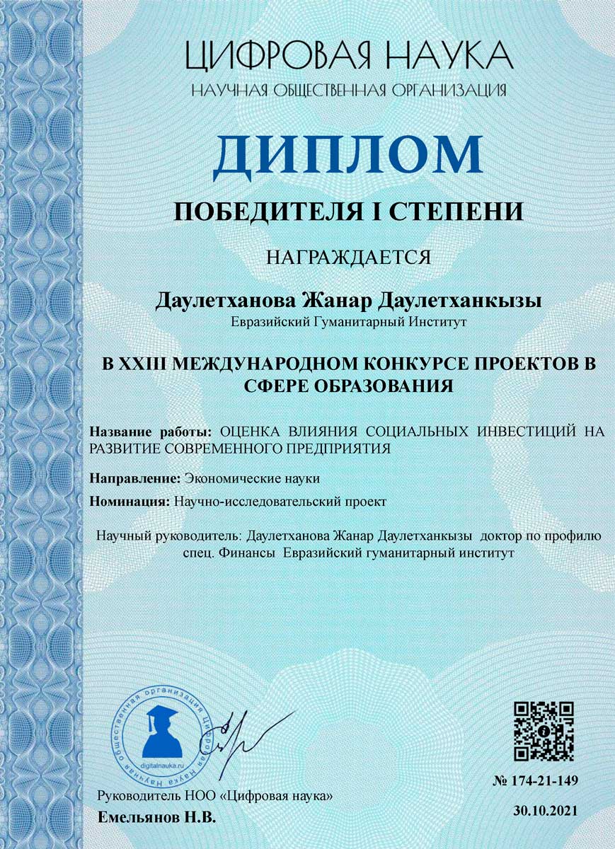 1 ноября 2021 года м.э.н., старший преподаватель кафедры экономических и математических дисциплин Дәулетханова Жанар Дәулетханқызы приняла участие в XXIII международном онлайн конкурсе проектов в сфере образования и была удостоена диплома I степени. Тема работы: «Оценка влияния социальных инвестиций на развитие современного предприятия». Научно – образовательная платформа: «Цифровая Наука» http://digitalnauka.ru (г.Саратов, РФ).
