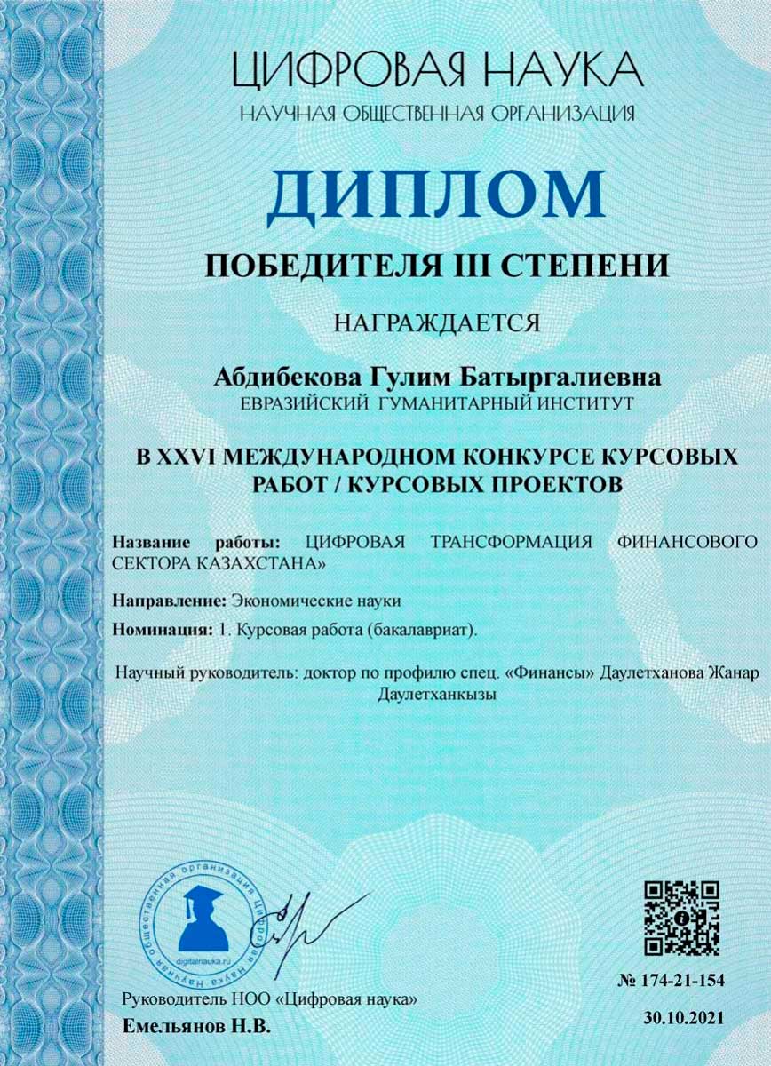 30 октября 2021 года студент 2 курса образовательной программы «Финансы» Абдибекова Гулим приняла участие в XXVI международном онлайн конкурсе курсовых работ (направление: «Экономические науки») и завоевала диплом III степени. Тема работы: «Цифровая трансформация финансового сектора Казахстана»; научный руководитель: м.э.н., старший преподаватель Дәулетханова Ж.Д. Научно – образовательная платформа: «Цифровая Наука» http://digitalnauka.ru (г. Саратов, РФ).