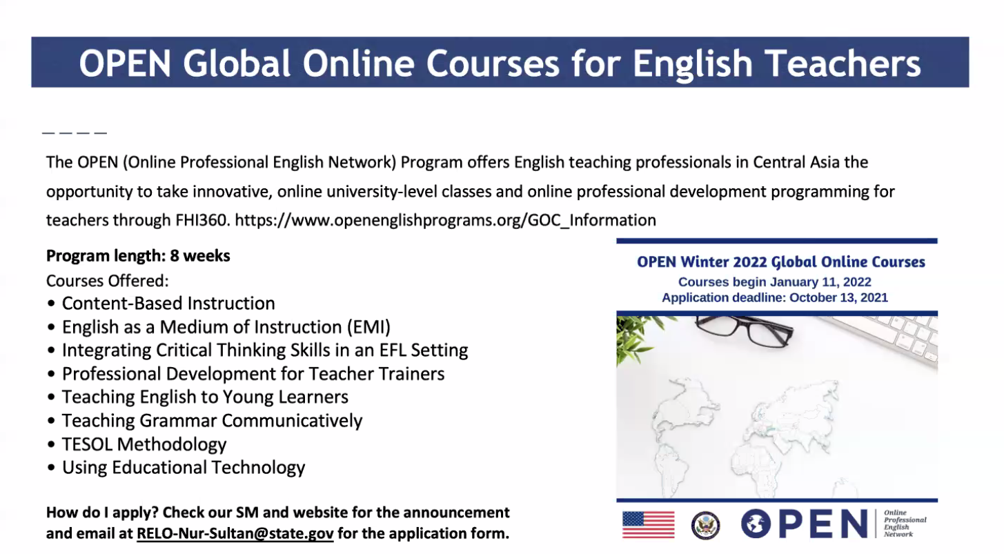 В обучении приняли участие к.п.н., доцент, заведующая кафедрой Л.В. Волкова; PhD, хабилитированный профессор Евсеев В.С.; м.п.н., доцент Ильясова А.У.; м.п.н., доцент Аренова Г. У.; м.п.н., доцент Байтурина У.К.; PhD, доцент Оспанова Ж.Т.; м.п.н., доцент Давлетова С.Е.; м.п.н., старший преподаватель Салык Жумабек; м.г.н., старший преподаватель Султанова С.М.; м.п.н., старший преподаватель Каирова Ж.М.; м.п.н., старший преподаватель Ергалиева А.Н.; старший преподаватель Никульшина Н.В.; м.ф.н., старший преподаватель Давлеткалиева Г.С.; м.п.н., старший преподаватель Хасилан Фариза; преподаватель Гыля А.А. и др.