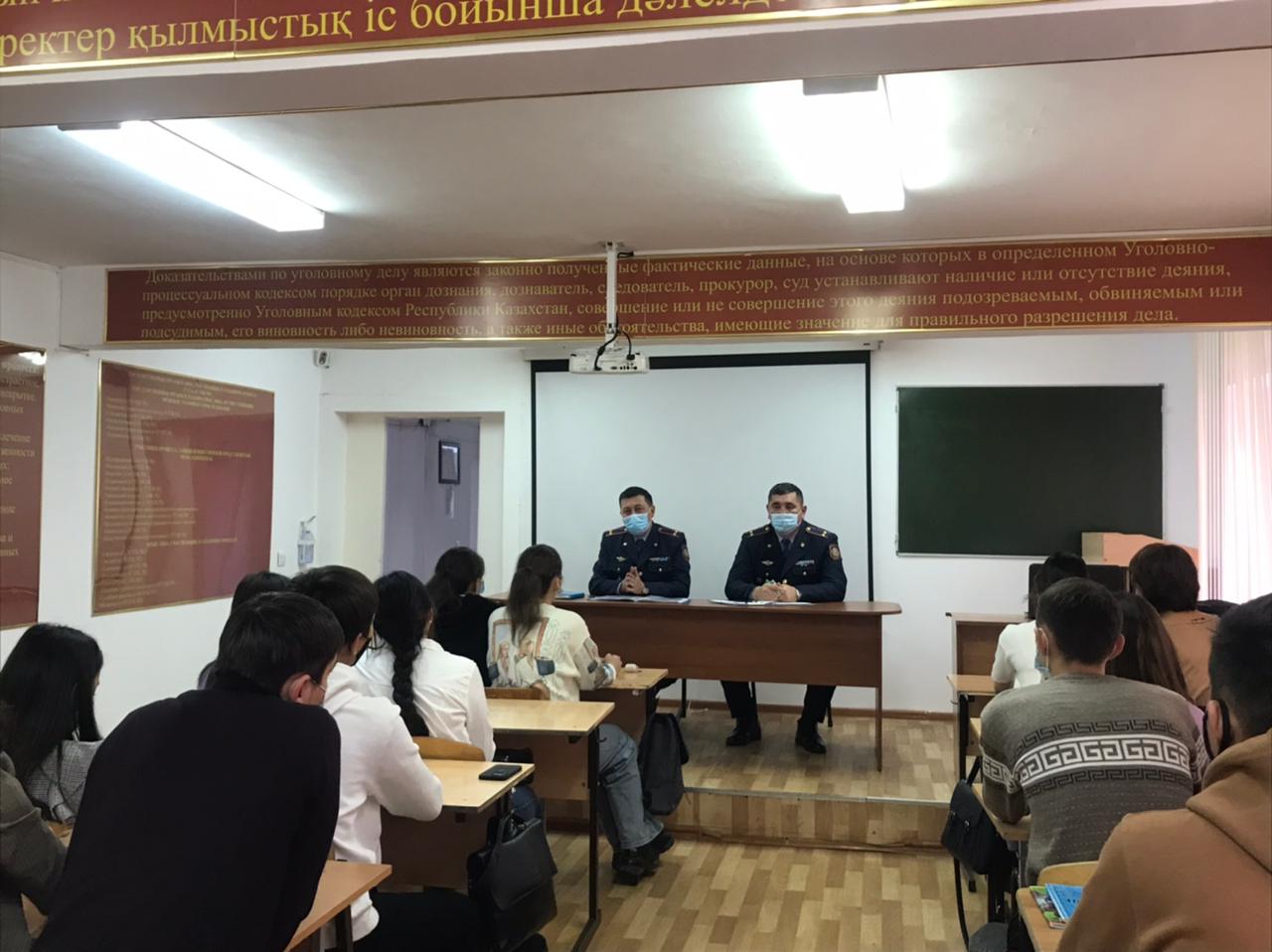 12 ноября 2021 года в стенах Евразийского гуманитарного института прошла встреча с начальником Отдела кадровой политики Управления полиции района «Алматы» подполковником полиции Жаппаровым А.С., а также с заместителем начальника управления полиции района «Алматы» подполковником полиции Абишевым Е.Б. На встрече присутствовали студенты выпускного курса образовательной программы «Юриспруденция». Основная тема встречи – трудоустройство в Органы внутренних дел РК, а также освещение основных аспектов службы.
