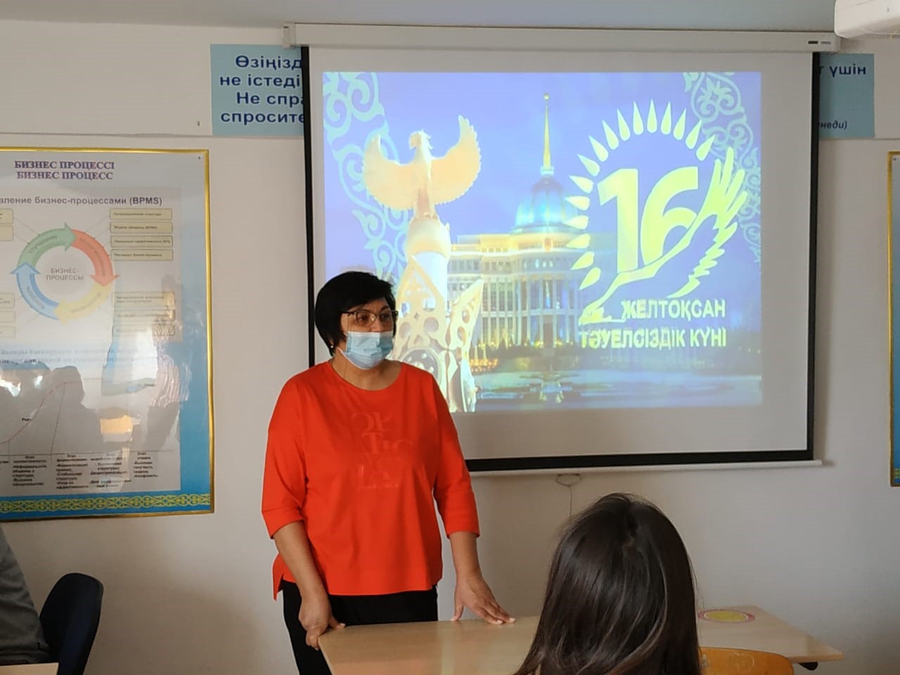 13 декабря 2021 года кураторы кафедры экономических и математических дисциплин Даулетханова Ж.Д. и Тажигулова А.Ж. для студентов образовательной программы «Финансы» провели кураторский час на тему «Тәуелсіздік – ел мерейі». Целью кураторского часа является повышение интеллектуального уровня учащихся, развитие познавательного интереса к истории родной страны, воспитание патриотизма.