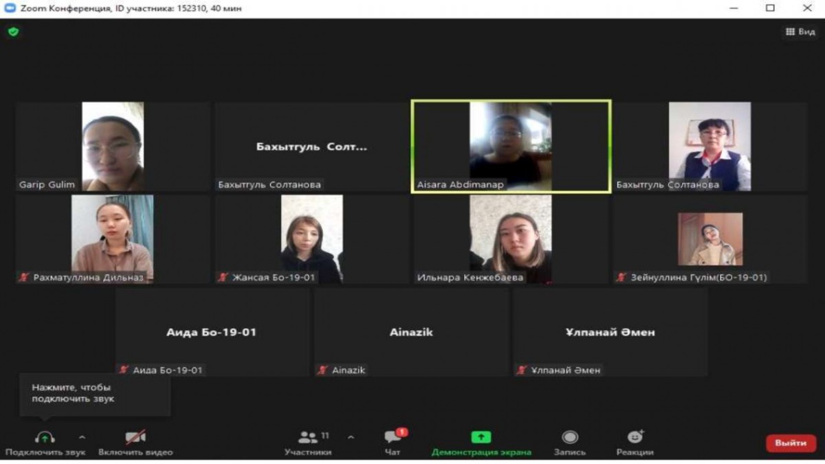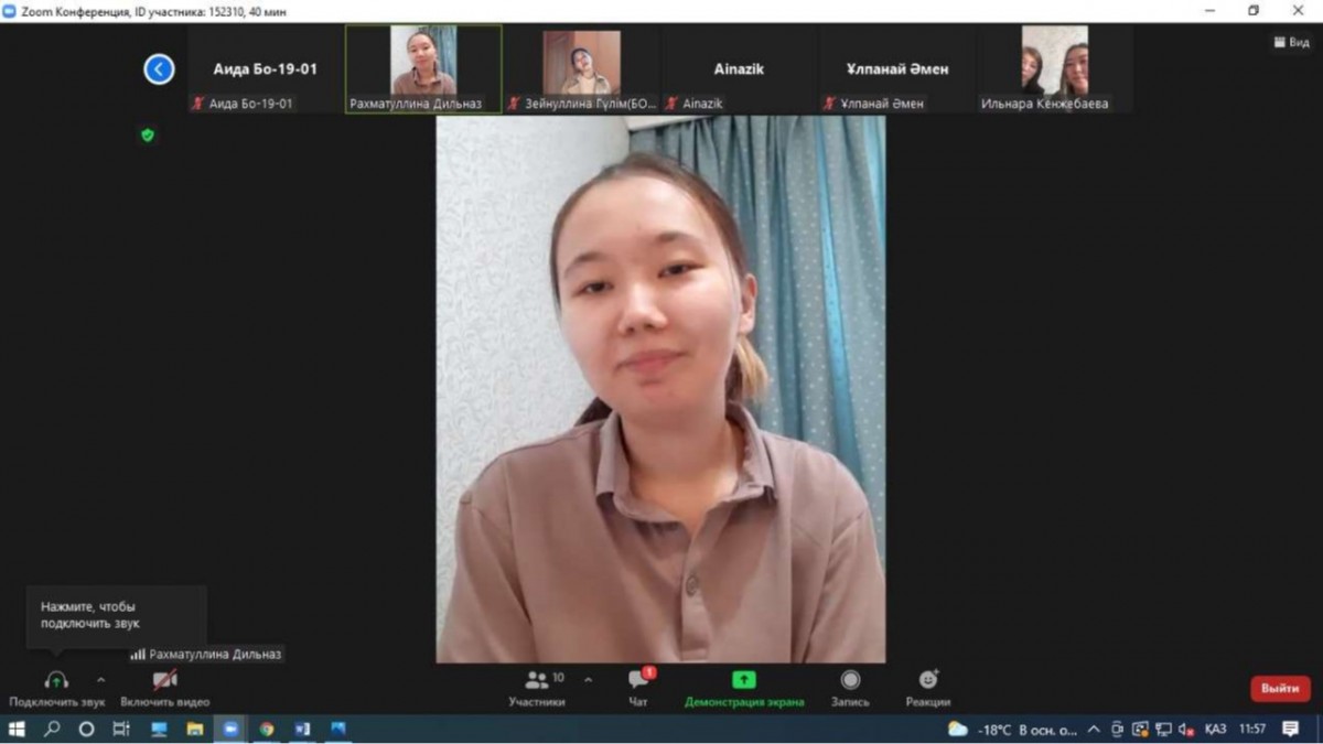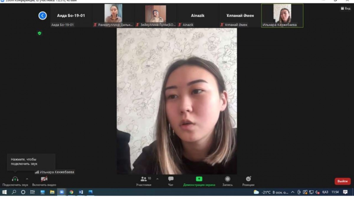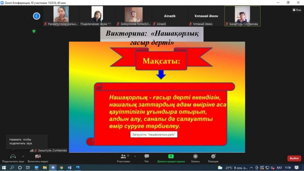 11 февраля 2022 года куратор Солтанова Б.Т. для студентов 3 курса образовательной программы «Педагогика и методика начального обучения» (академическая группа БО-19-01) с целью профилактики наркомании провела викторину на тему «Нашақорлық ғасыр дерті». В рамках мероприятия были рассмотрены причины, пагубные последствия и меры профилактики наркозависимости в молодежной среде. Участники викторины, дополняя ответы сверстников и выражая свое мнение, получили интересную и полезную информацию по обсуждаемой теме.