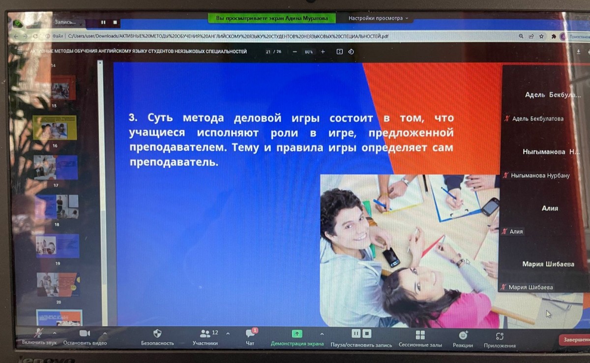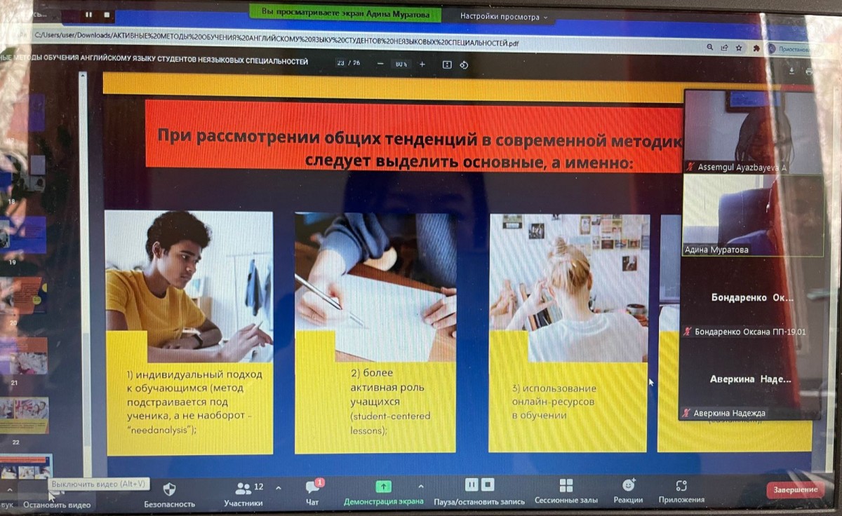 14 февраля 2022 года в рамках входящей зарубежной академической мобильности старший преподаватель УНПК «Международный университет Кыргызстана» Муратова А.А. приступила к чтению лекций по дисциплине «Активные методы обучения английскому языку студентов неязыковых специальностей» для студентов 3 курса образовательной программы 6В01102 – «Педагогика и психология» Евразийского гуманитарного института.