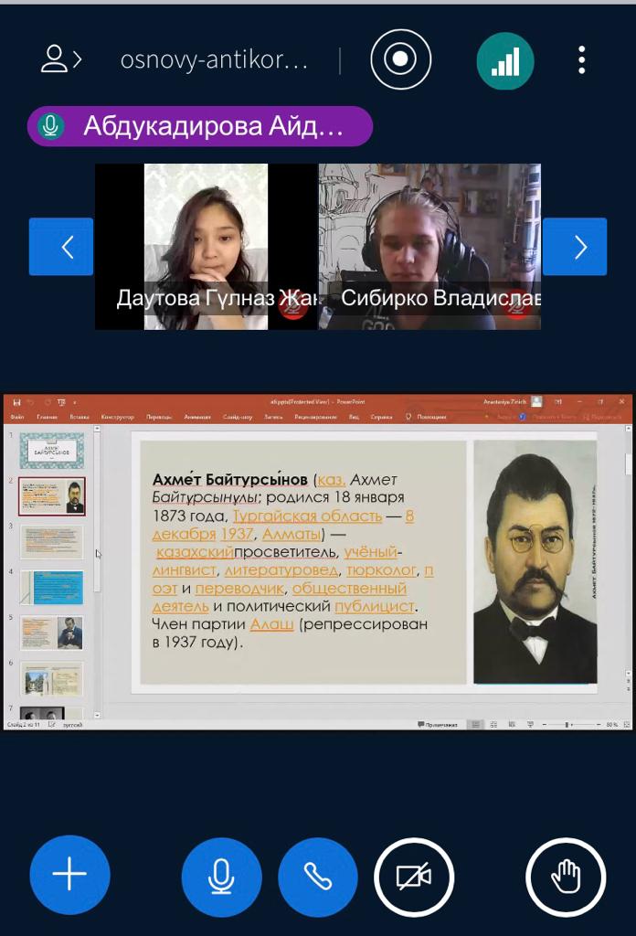 18 февраля 2022 года куратор Канафина Г.А для студентов академической группы ЮР-21-01 (образовательная программа «Юриспруденция») провела кураторский час «Ахмет Байтурсынов – сеятель человечности и знаний», посвященный 150-летию со дня рождения А.Байтурсынова. Выступая перед собравшимися, Канафина Г.А. подчеркнула, что вся жизнь Ахмета Байтурсынова была пронизана пламенной заботой о самоопределении казахов, развитии культуры, образования и науки, сохранении самобытного народного творчества и духа нации.