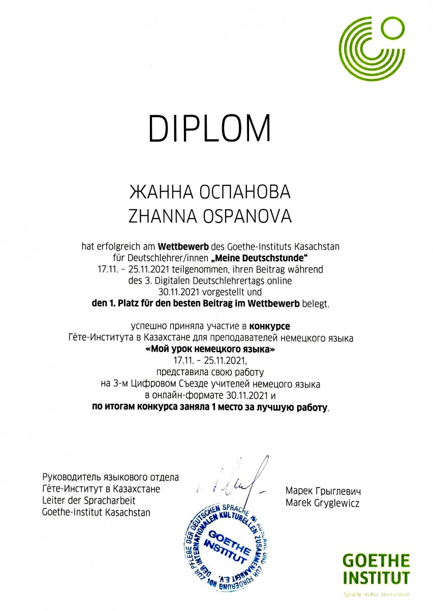 В ноябре 2021 года доктор философии, доцент кафедры иностранных языков Оспанова Ж. Т. приняла участие в конкурсе Гете-Института в Казахстане для преподавателей немецкого языка Meine Deutsch stunde («Мой урок немецкого языка»). 21 февраля 2022 года объявлены результаты конкурса, согласно которым доцент Оспанова Ж.Т. стала его победителем.