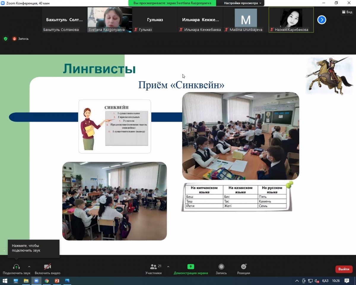 23 февраля 2022 года учителем начальных классов КГУ «Школа – гимназия № 32» Разгоняевой Светланой Владимировной проведен онлайн семинар «Активные методы и формы работы в рамках обновлённого содержания образования» для студентов образовательной программы 6В01303 – «Педагогика и методика начального обучения». Обучающиеся приняли активное участие в работе семинара, задали большое количество вопросов по обсуждаемой теме. Встреча завершилась признанием профессионализма выпускника института и наилучшими пожеланиями успехов в дальнейшем.