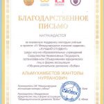 За оказанную поддержку молодым ученым благодарственными письмами награждены к.ю.н., доцент кафедры юридических дисциплин Альмухамбетов Ж.Н., м.п.н., доцент кафедры иностранных языков Алипбекова Л. У. и м.э.н., старший преподаватель кафедры экономических и математических дисциплин Дәулетханова Ж. Д.