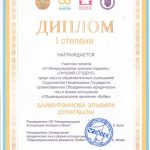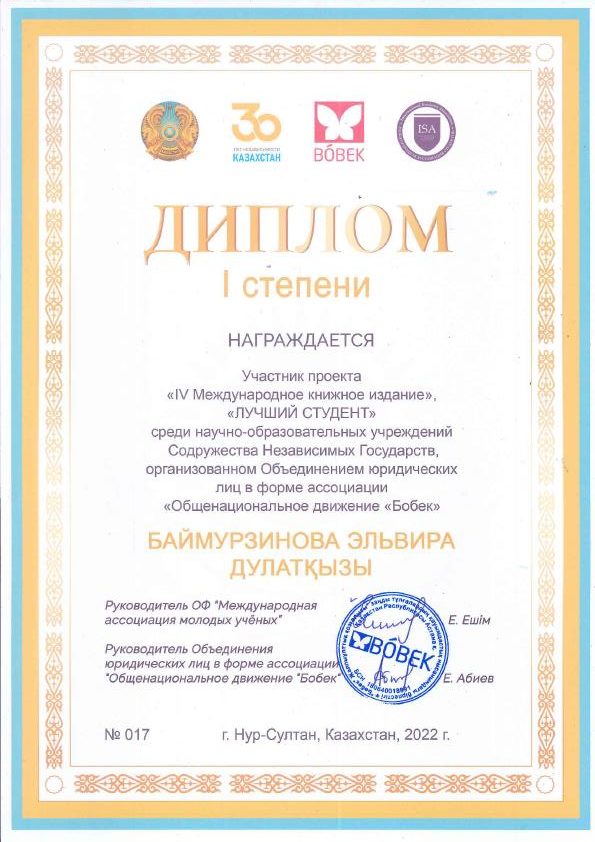 диплом 1 степени – Баймурзинова Эльвира Дулатқызы, студент 3 курса образовательной программы «Юриспруденция»;