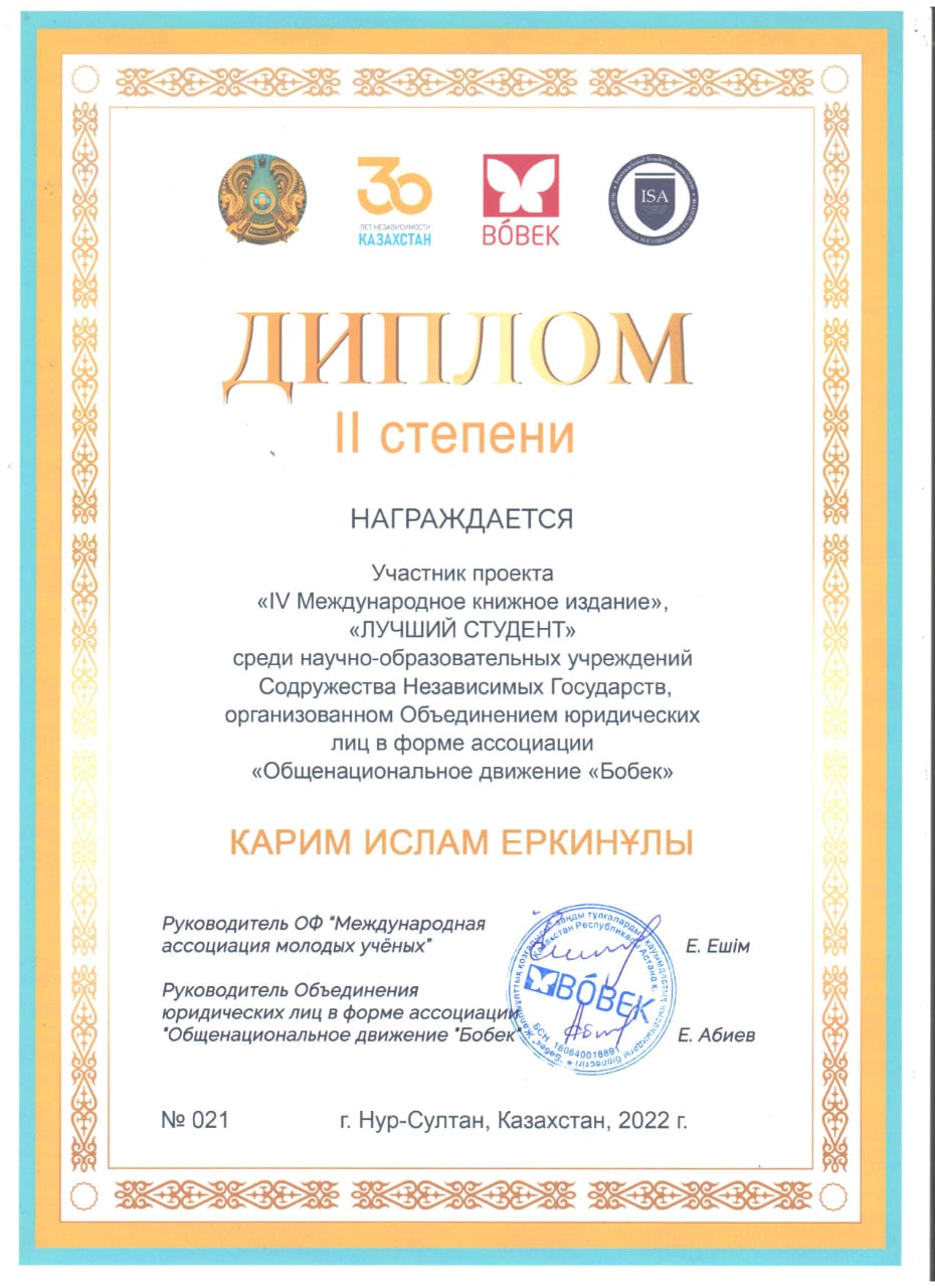 диплом 2 степени – Карим Ислам Еркинұлы, студент 4 курса образовательной программы «Переводческое дело»;