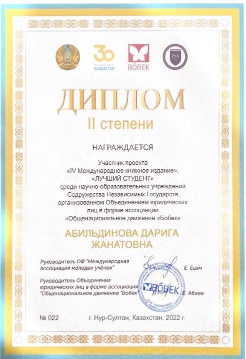 диплом 2 степени – Абильдинова Дарига Жанатовна, студент 4 курса образовательной программы «Финансы».